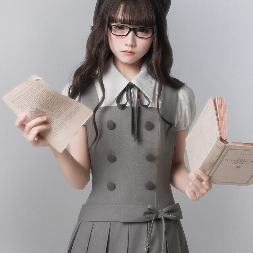 古書の並ぶ図書室で、静かにページをめくるような空気感。クラシカルロリータが持つ「知性と可愛らしさの均衡」を、グレーとホワイトの誠実な配色で表現した1セットです。