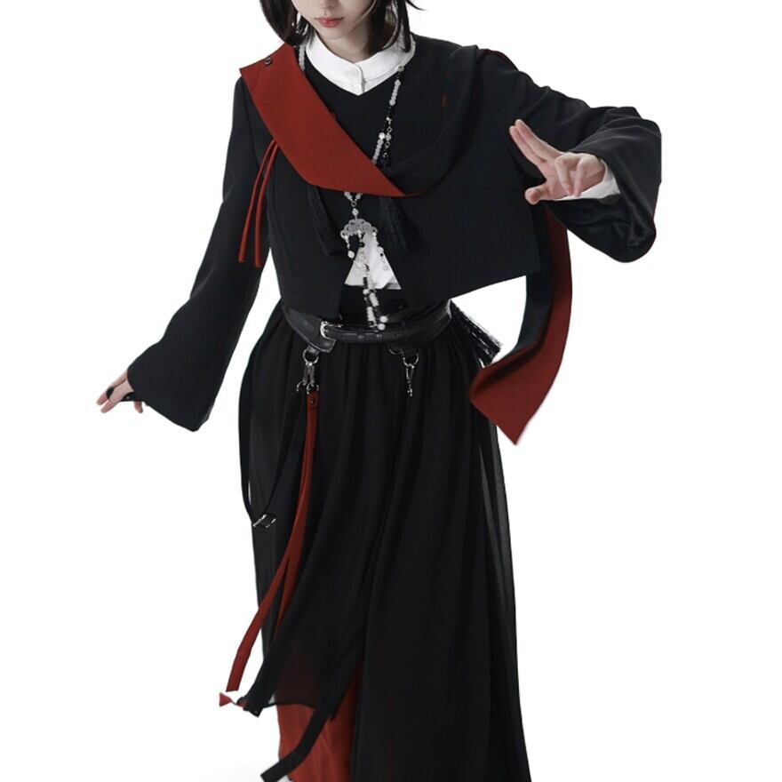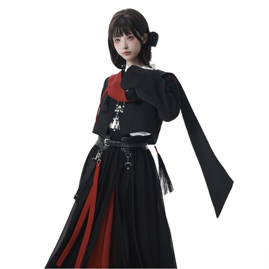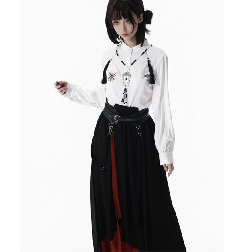 白の静けさの中に、赤い装飾がひとつだけ灯るような和ロリータの空気感。黒や深い赤のアイテムと重ねることで、控えめながらも凛とした余韻をまとえるブラウスです。