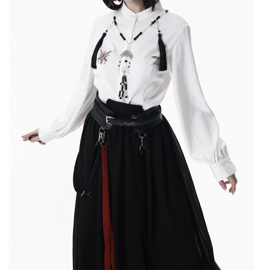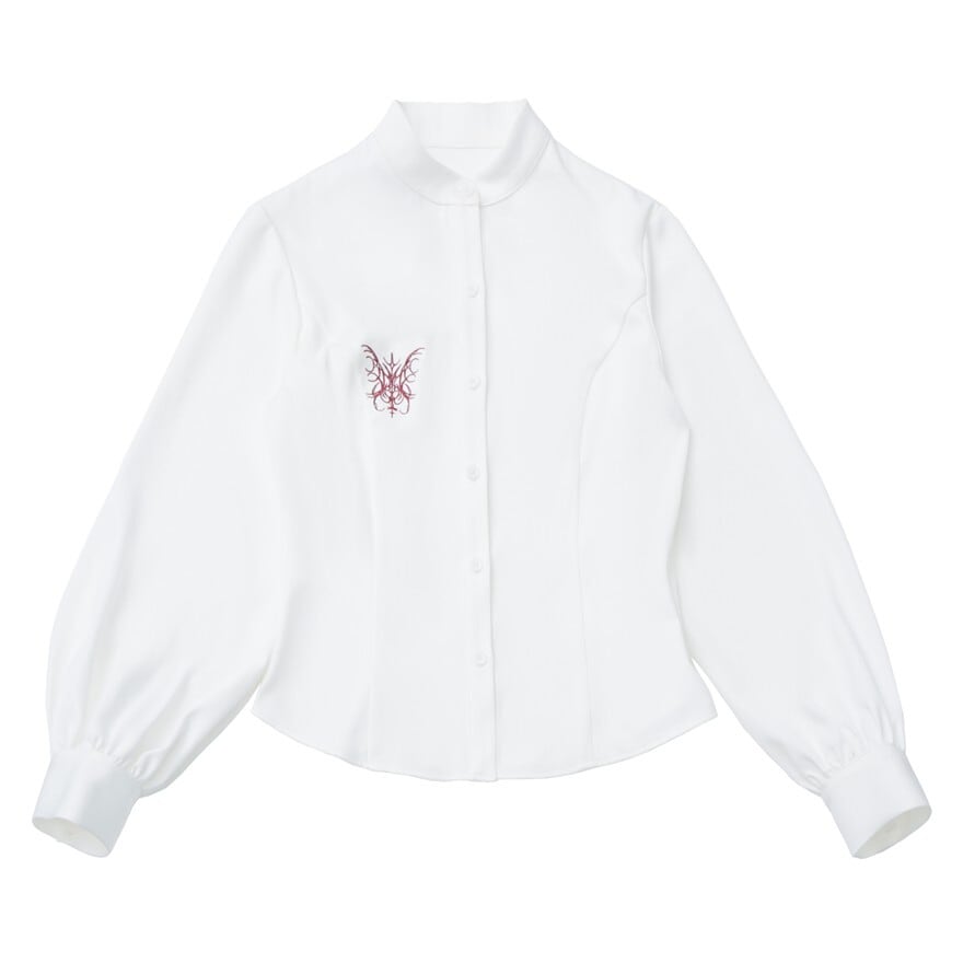 清楚なホワイトを基調に、胸元の赤い刺繍が静かに印象を残すブラウスです。丸みのある襟元とふんわりした袖がやわらかさを添えながら、すっきりとした前開きでコーデに取り入れやすい一着。和ロリータやゴシック寄りの装いに合わせると、白の抜け感が全体を上品に整えてくれます。