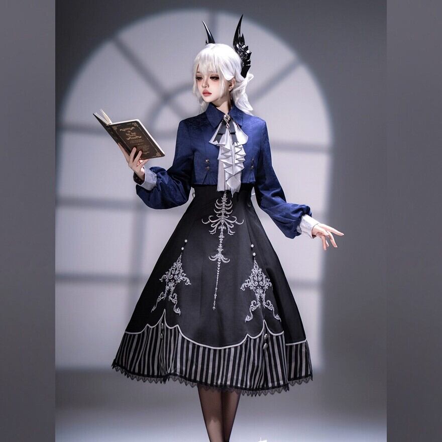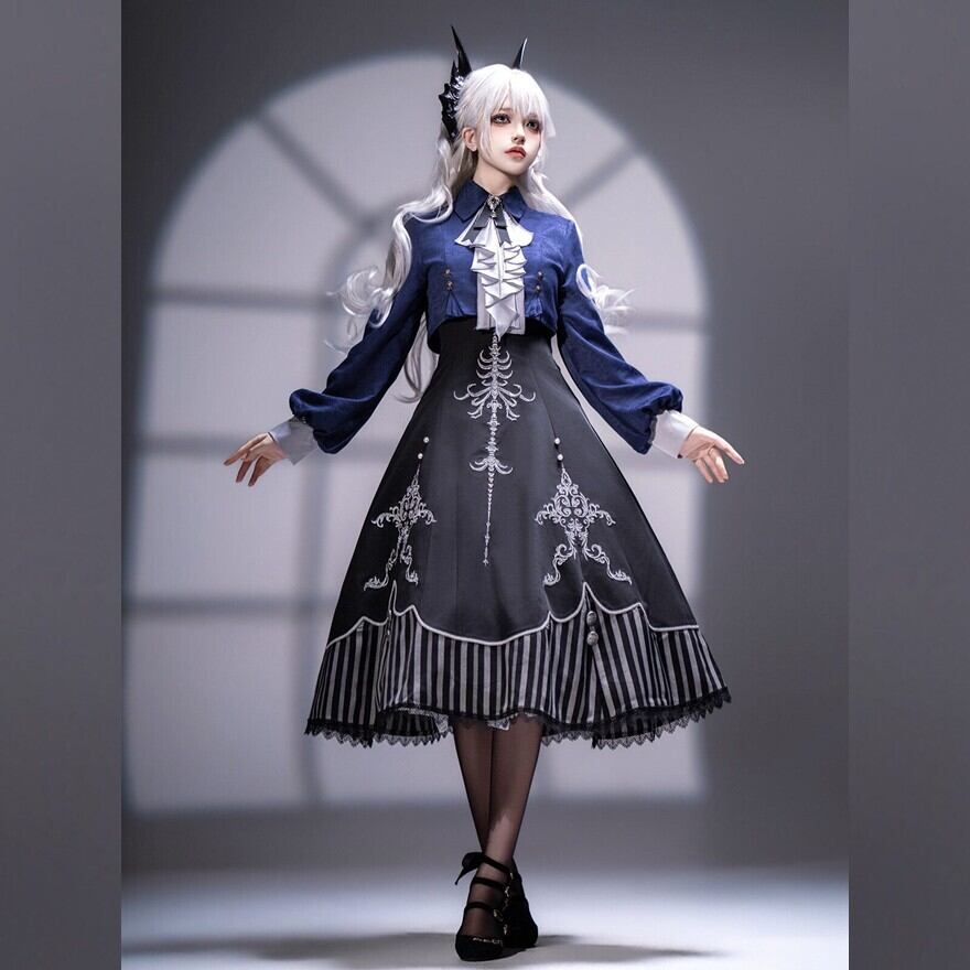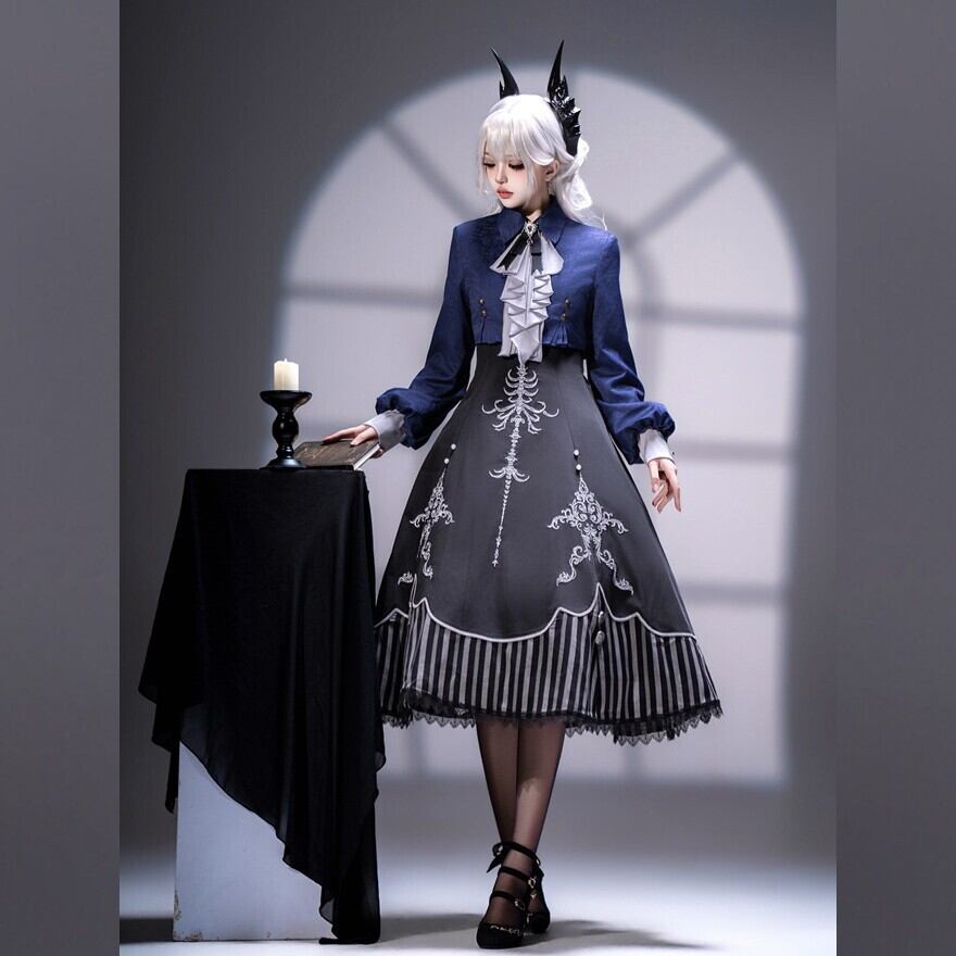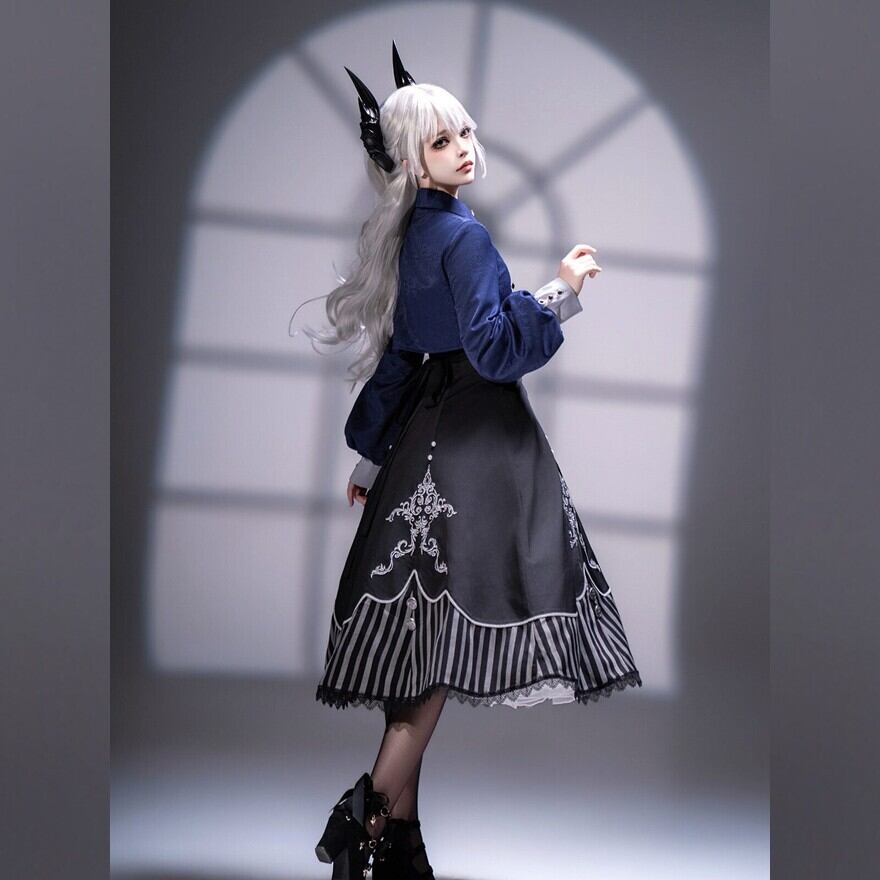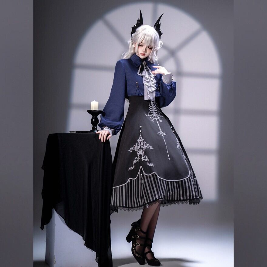 夜の洋館に灯るシャンデリアの下で、静かに裾を揺らすようなクラシカルロリータの空気感。ブラックとネイビーの深い配色に白い刺繍が浮かび、アンティークな美しさを引き立てます。
