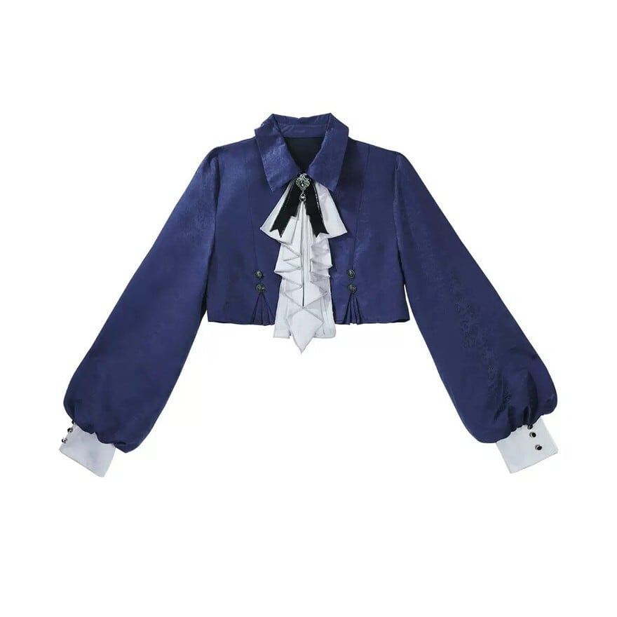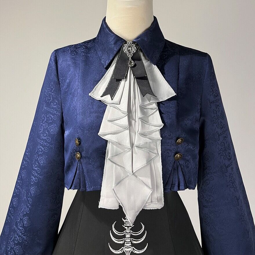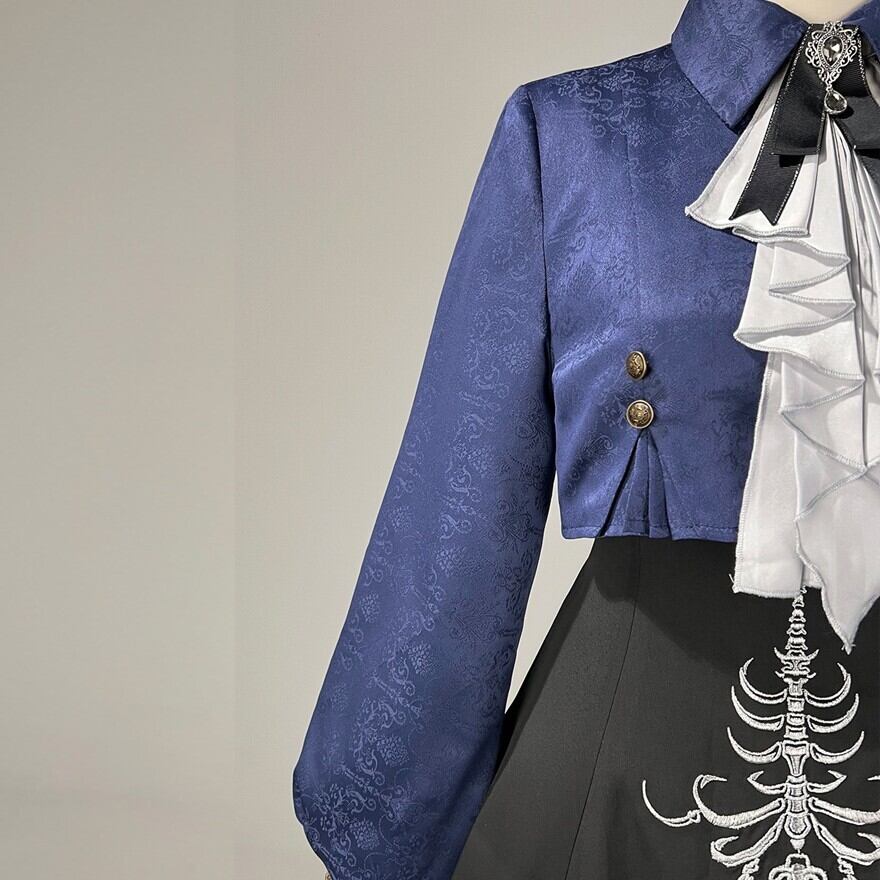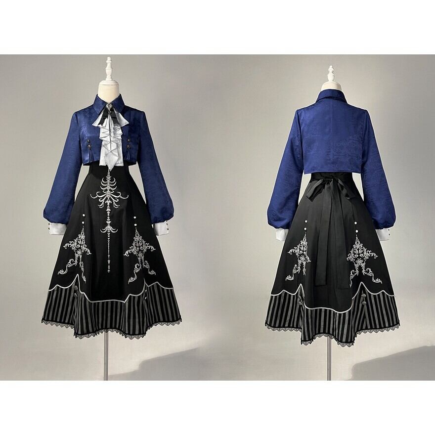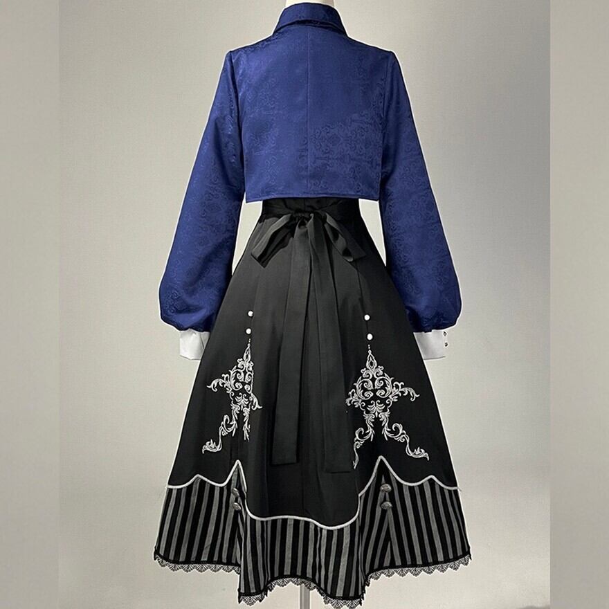 深いネイビーのボレロと、ブラックのジャンパースカートを組み合わせたクラシカルロリータの2点セットです。胸元のフリルやリボン、スカートに入った白の刺繍が、落ち着いた色合いの中に上品な華やかさを添えています。甘さを抑えながらも、クラロリらしい気品を楽しみたい方に向いた一着です。