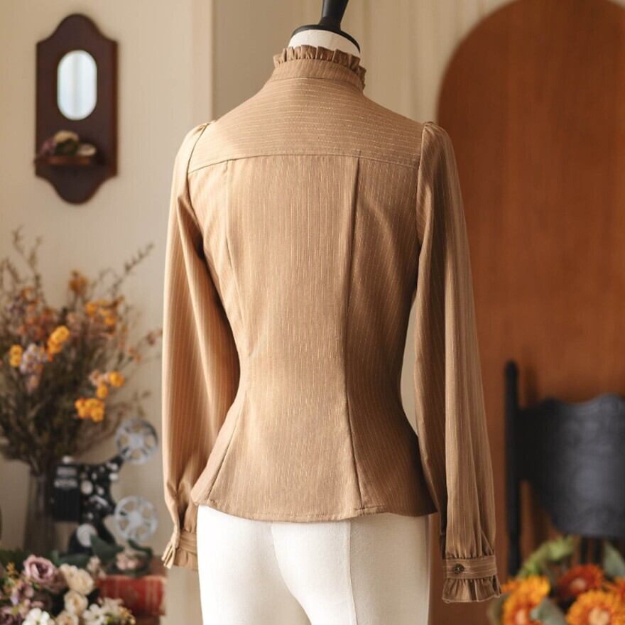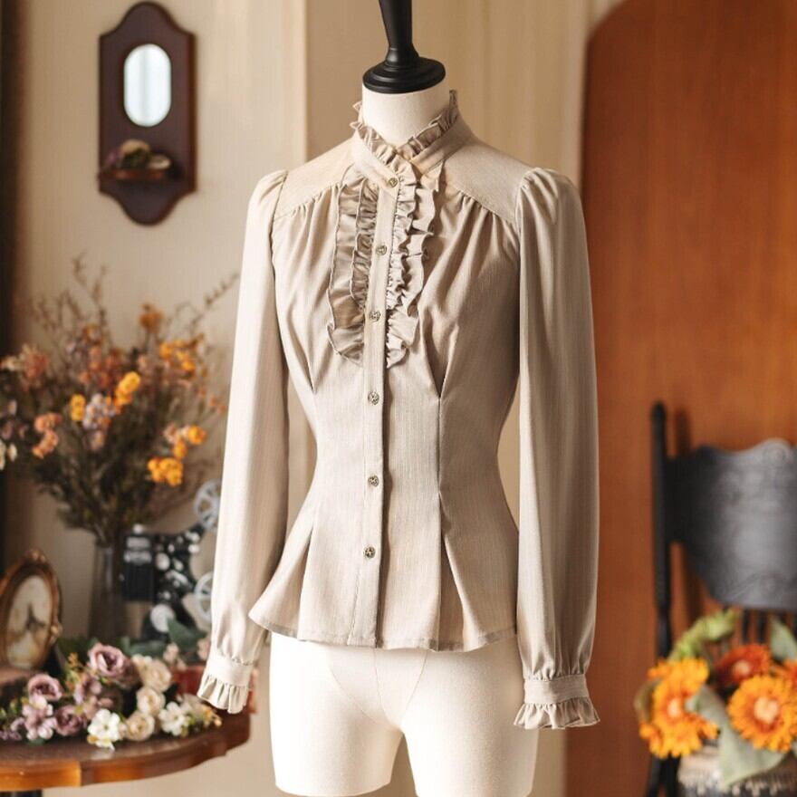 控えめなクラシカルロリータのフリルブラウス。ベージュ・ブラウンの落ち着いた色合いで、普段使いしやすいロリィタトップスを探している方におすすめです。