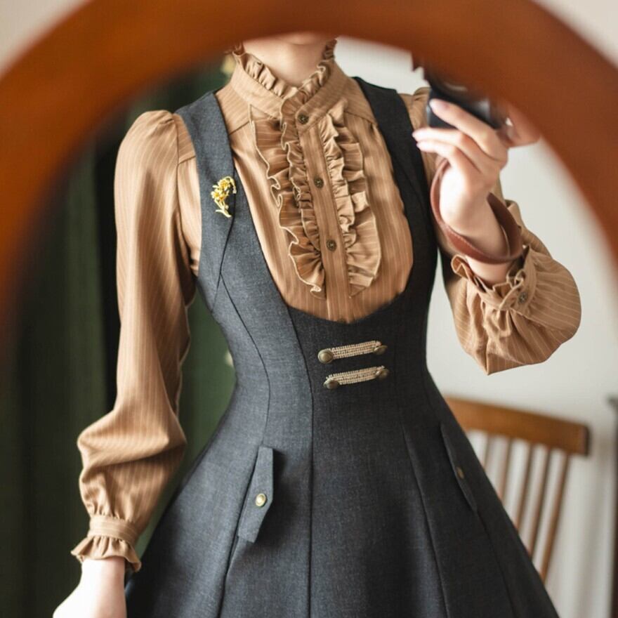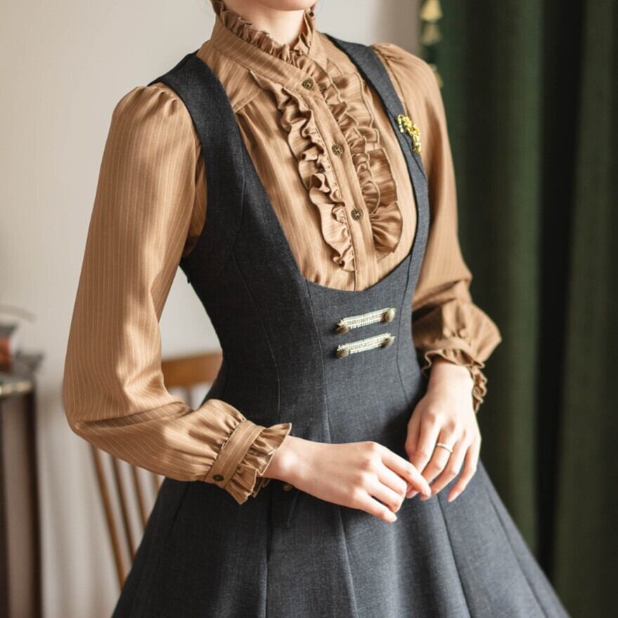 A. ベージュ・ブラウン系の落ち着いた色合いなので、ロリィタらしいフリルがありながら日常コーデにも取り入れやすいです。まずはブラウスからクラシカルな雰囲気を足したい方にも向いています。