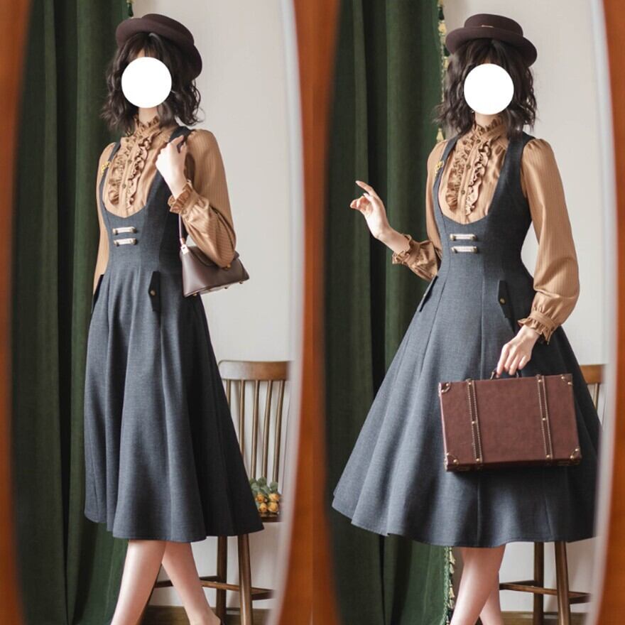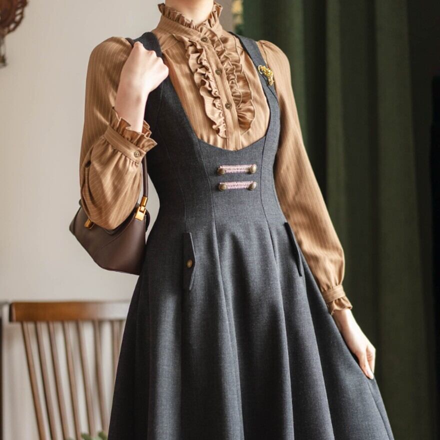 A. ジャンパースカート、ロングスカート、クラシカルなパンツなどと合わせやすいです。ブラウン系やブラック系のボトムスと合わせると、落ち着いた雰囲気にまとまりやすくなります。