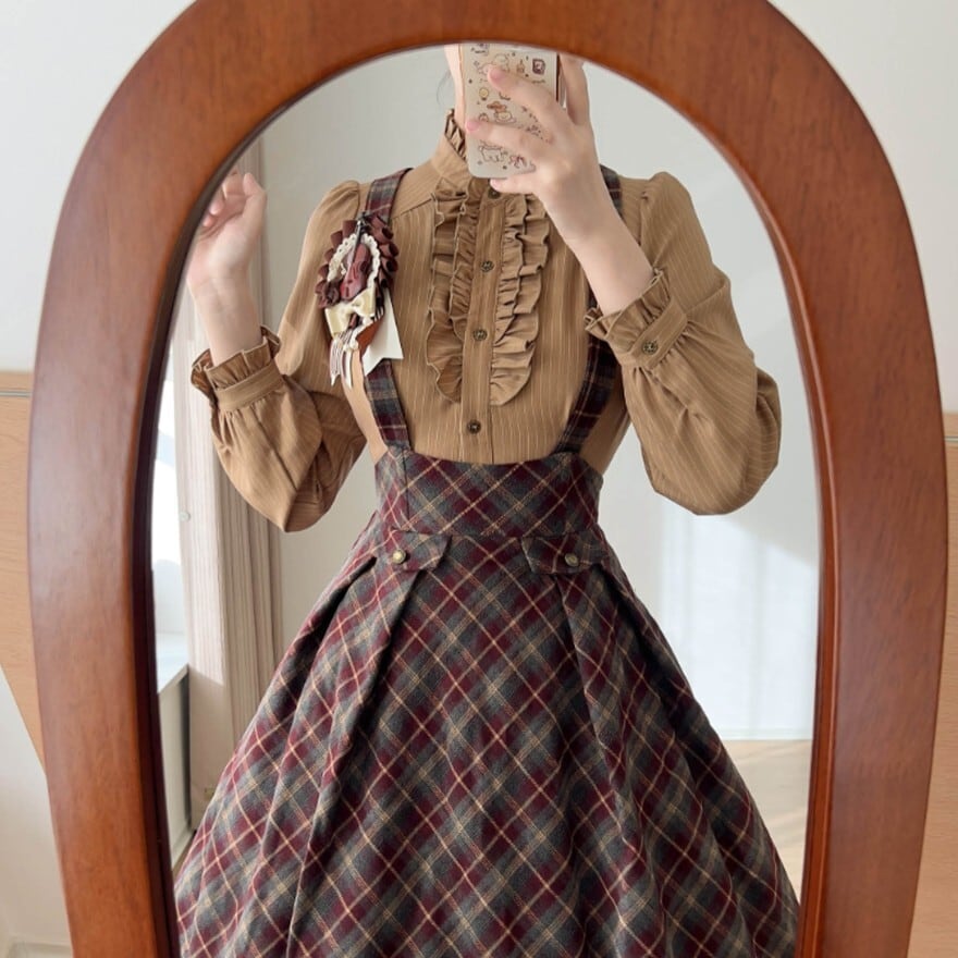 落ち着いたベージュ・ブラウン系のブラウスなので、ロリィタらしい装飾がありながらも普段着に近い感覚で取り入れやすいです。ジャンスカやスカートに合わせるだけで雰囲気が整いやすく、最初のクラシカルコーデにも使いやすい一枚です。