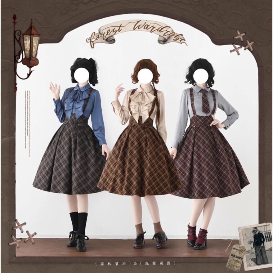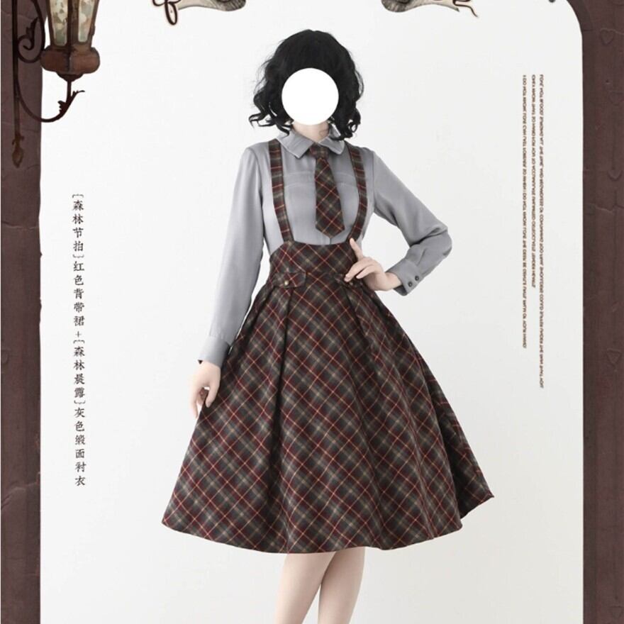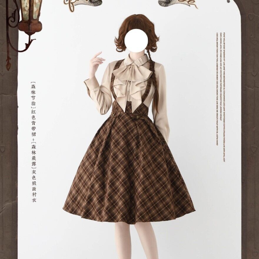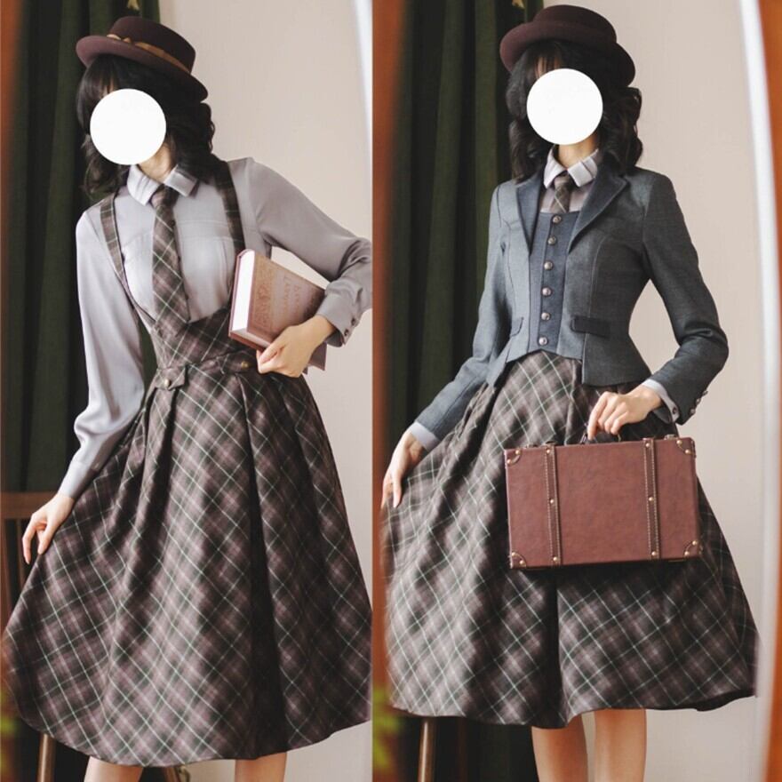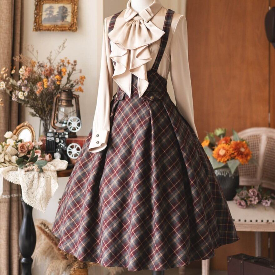 物語の中の学生や令嬢が、そのまま現代に現れたような佇まい。クラシカルなチェック柄とハイウエストシルエットが印象的なロリータスカートです。胸元から伸びるサスペンダーと同柄のネクタイが全体の統一感を生み、ふんわり広がるフレアラインが落ち着いた気品を演出します。静かな存在感でコーディネートを完成させる一着です。