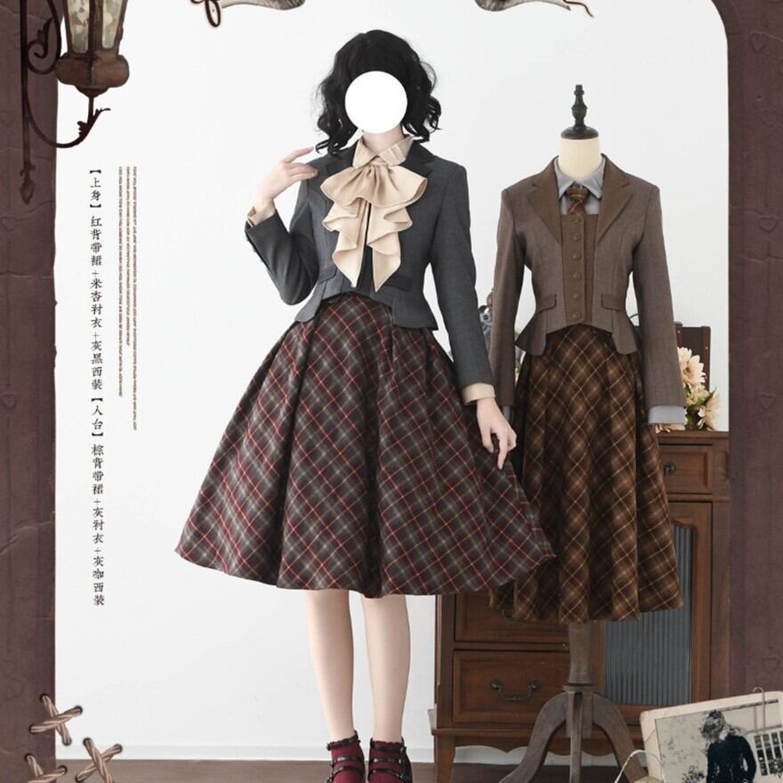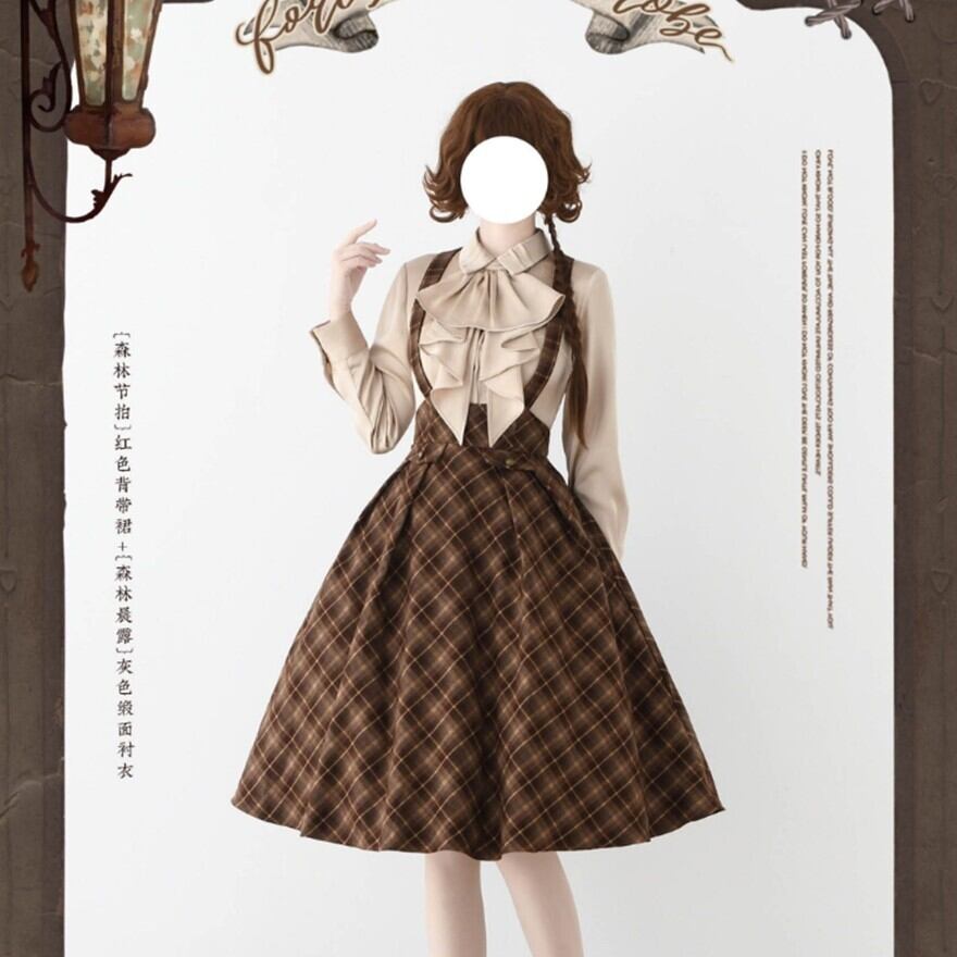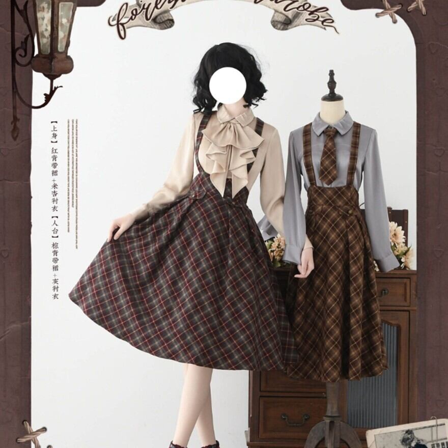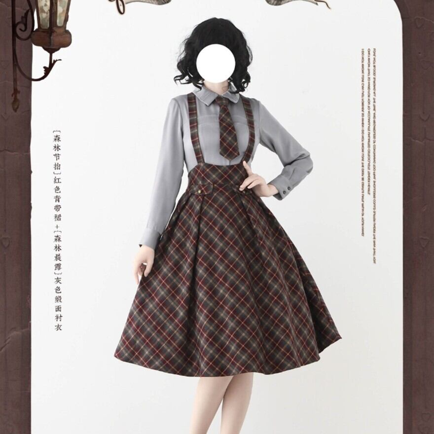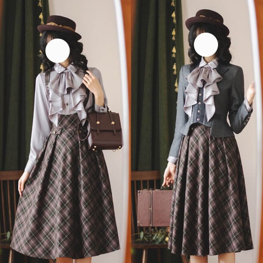 物語の中の学生や令嬢が、そのまま現代に現れたような佇まい。クラシカルなチェック柄とハイウエストシルエットが印象的なロリータスカートです。胸元から伸びるサスペンダーと同柄のネクタイが全体の統一感を生み、ふんわり広がるフレアラインが落ち着いた気品を演出します。静かな存在感でコーディネートを完成させる一着です。