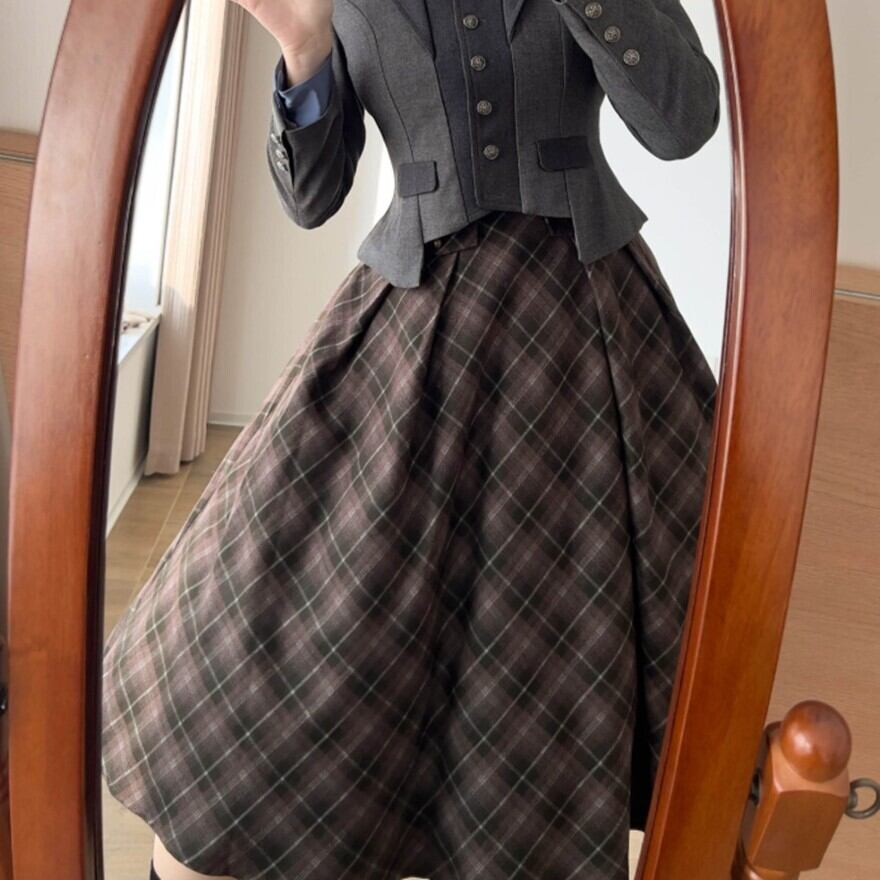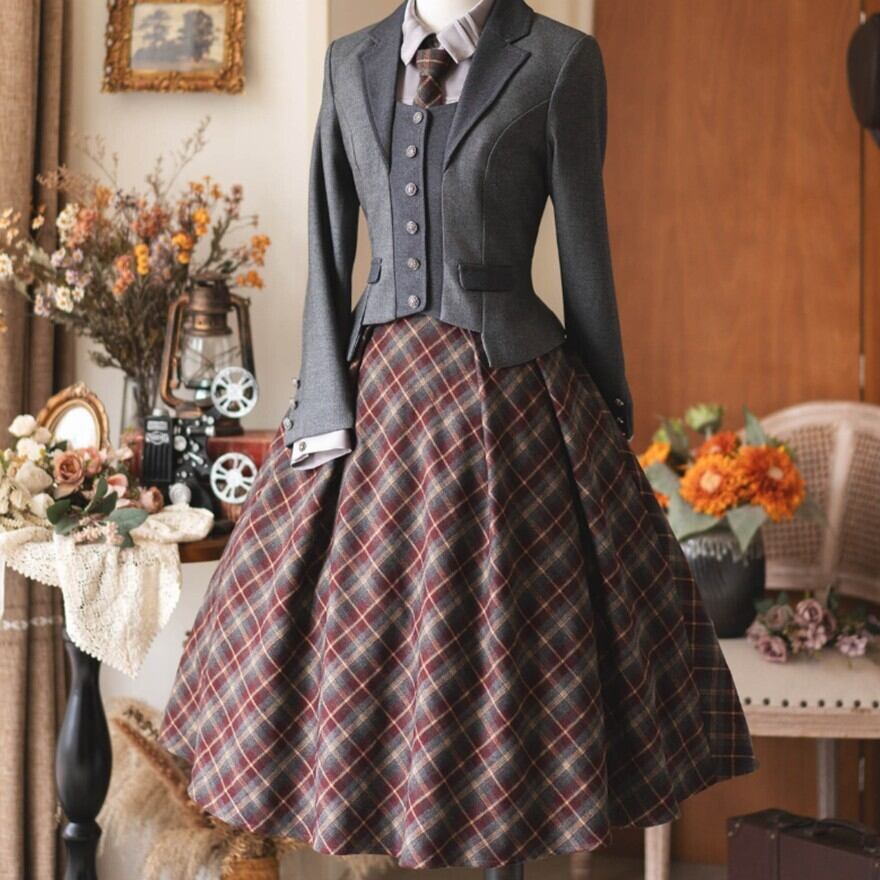 チェック柄の陰影とフレアラインが写真に奥行きを作り、クラシカルなポートレート撮影に映えるスタイルになります。