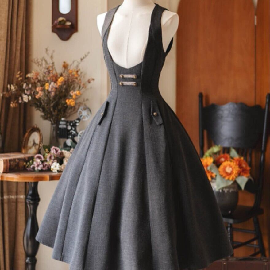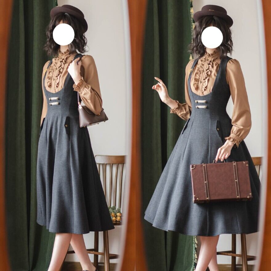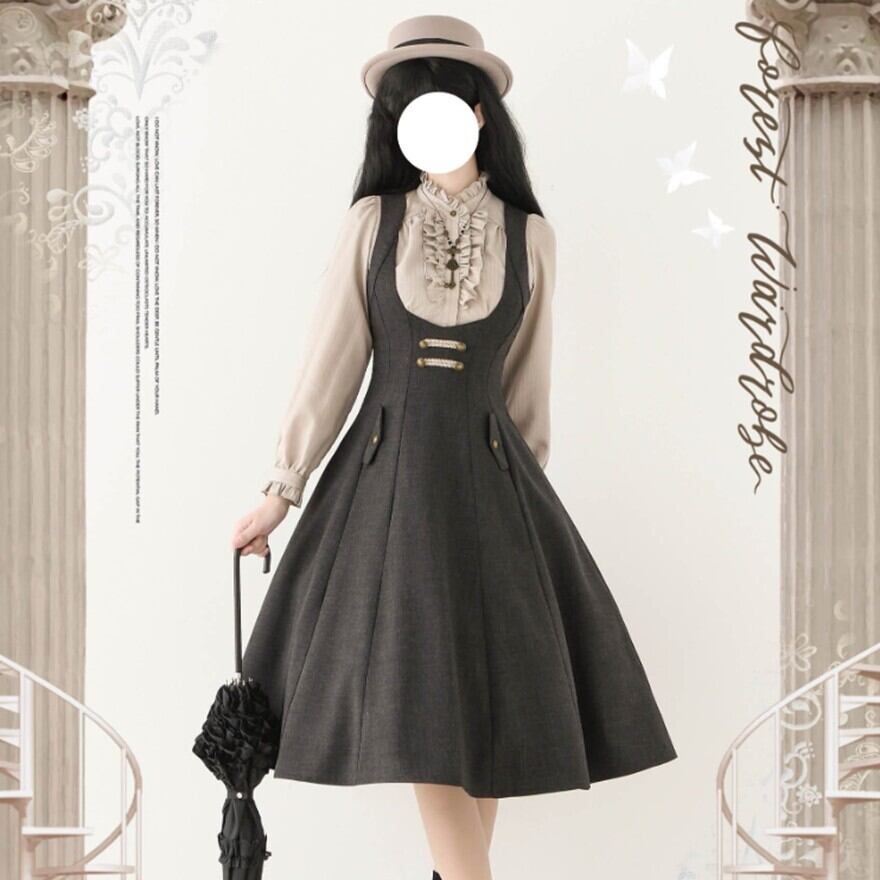 アンティークな街角をゆっくり歩くような、やわらかく落ち着いたクラシカルロリータの空気感。華美すぎないフレアシルエットが、日常の中に静かな品のよさを添えてくれます。