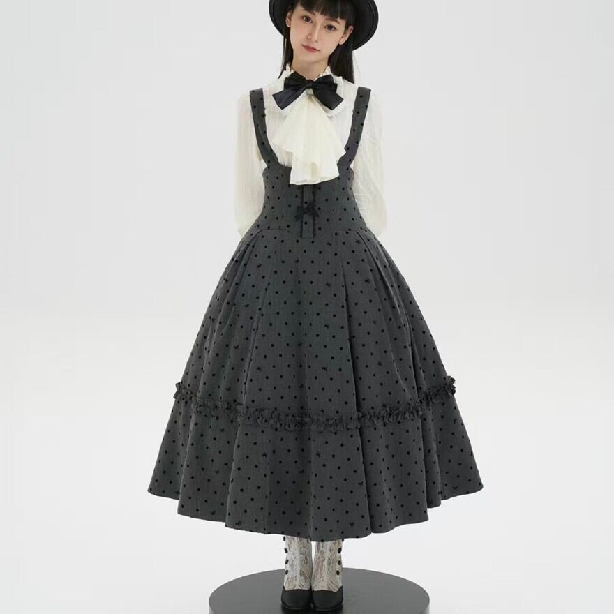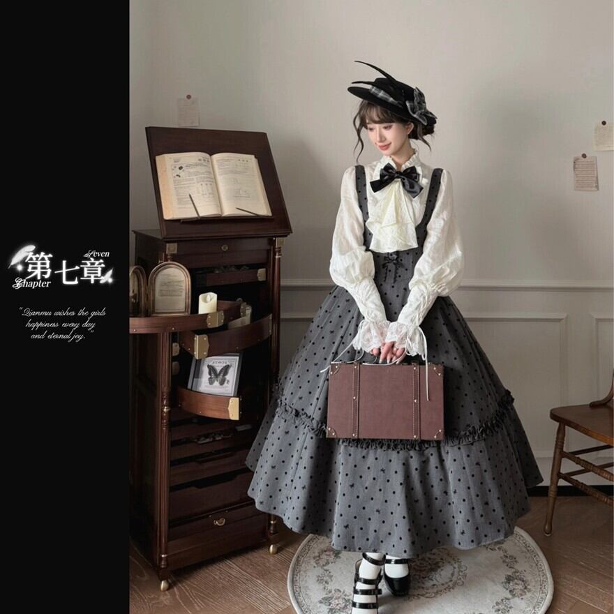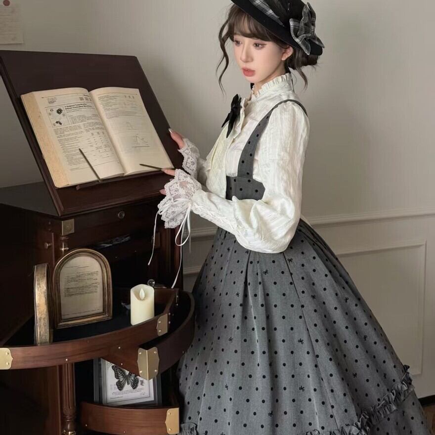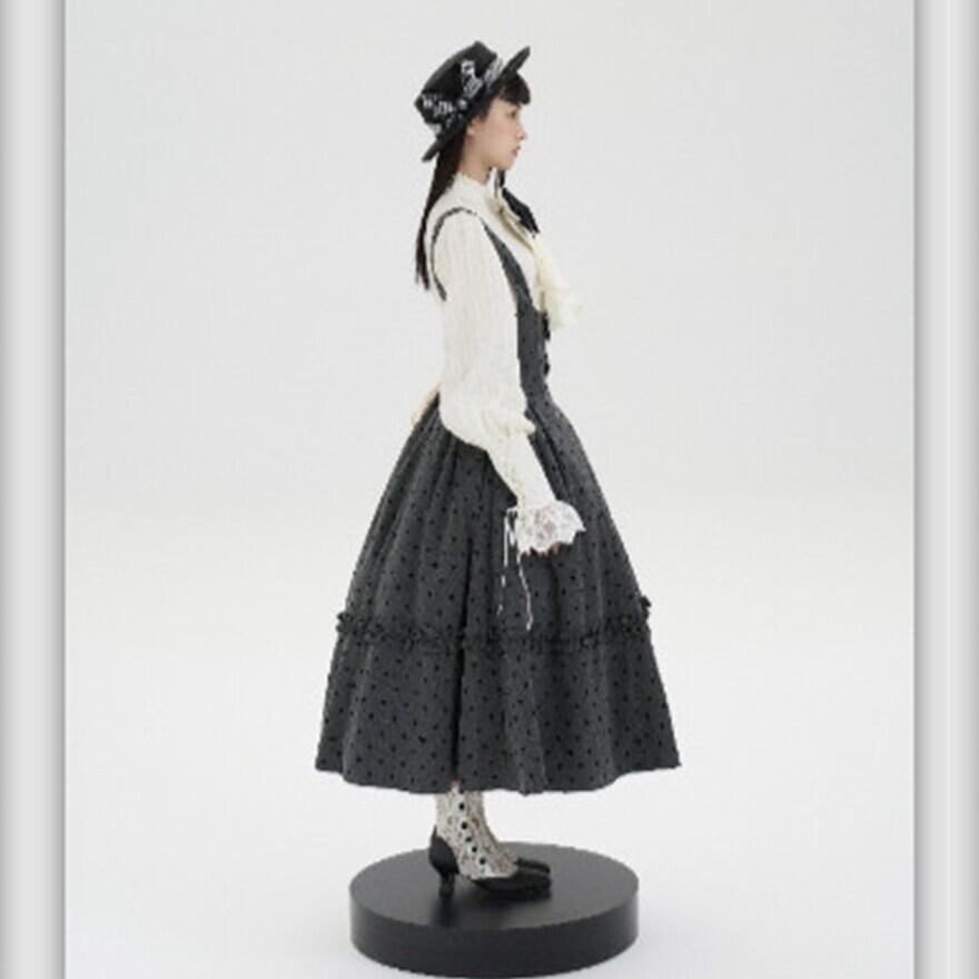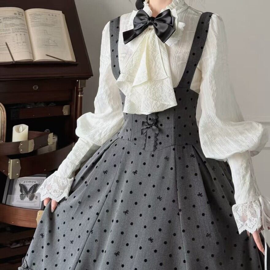 ブラックのドット柄ジャンパースカートに、ホワイトブラウスを合わせたクラシカルロリータの2点セットです。広がりのあるスカートラインと胸元のリボン、白ブラウスの軽やかさが重なり、黒を基調にしながら重たくなりすぎない印象に。甘さを控えたクラロリを楽しみたい方に選びやすい一着です。