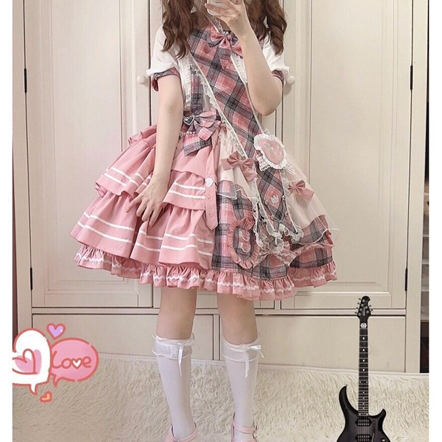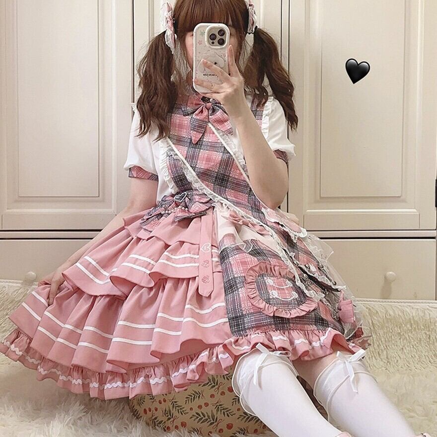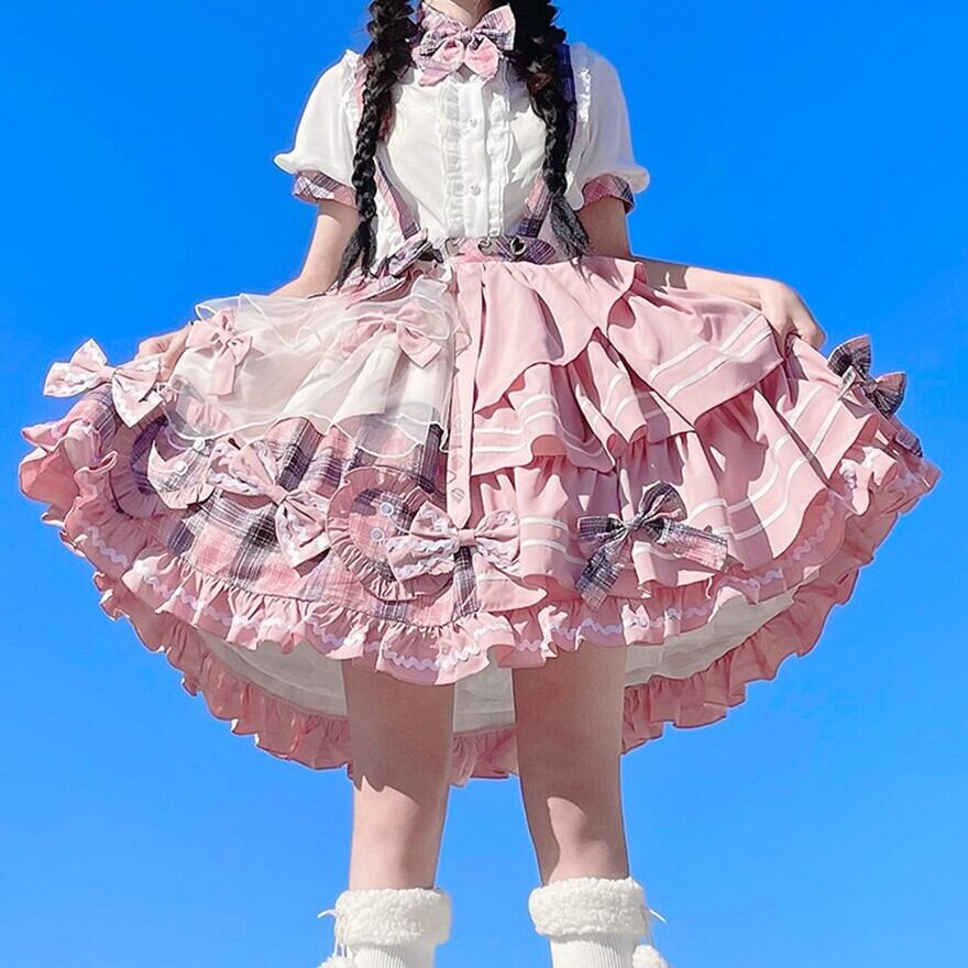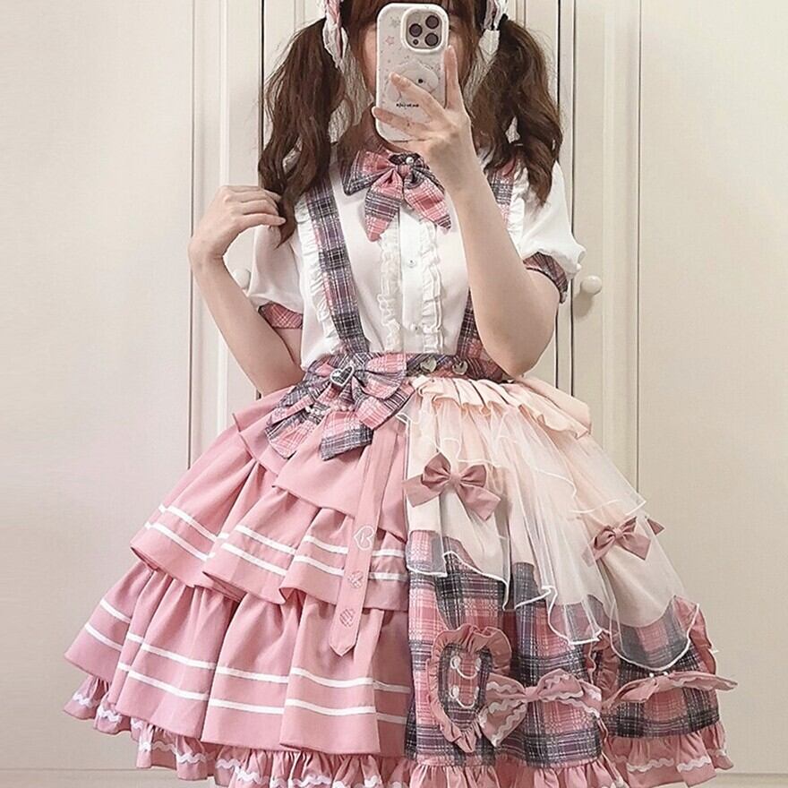 ピンクチェックとホワイトを組み合わせた、甘ロリらしい華やかさのあるセットアップです。ブラウスとジャンパースカートの2点構成で、リボンやフリル、ティアード風のスカートラインが可愛らしい印象を引き立てます。1着でしっかり世界観がまとまり、撮影やイベント、おでかけコーデにも使いやすいアイテムです。