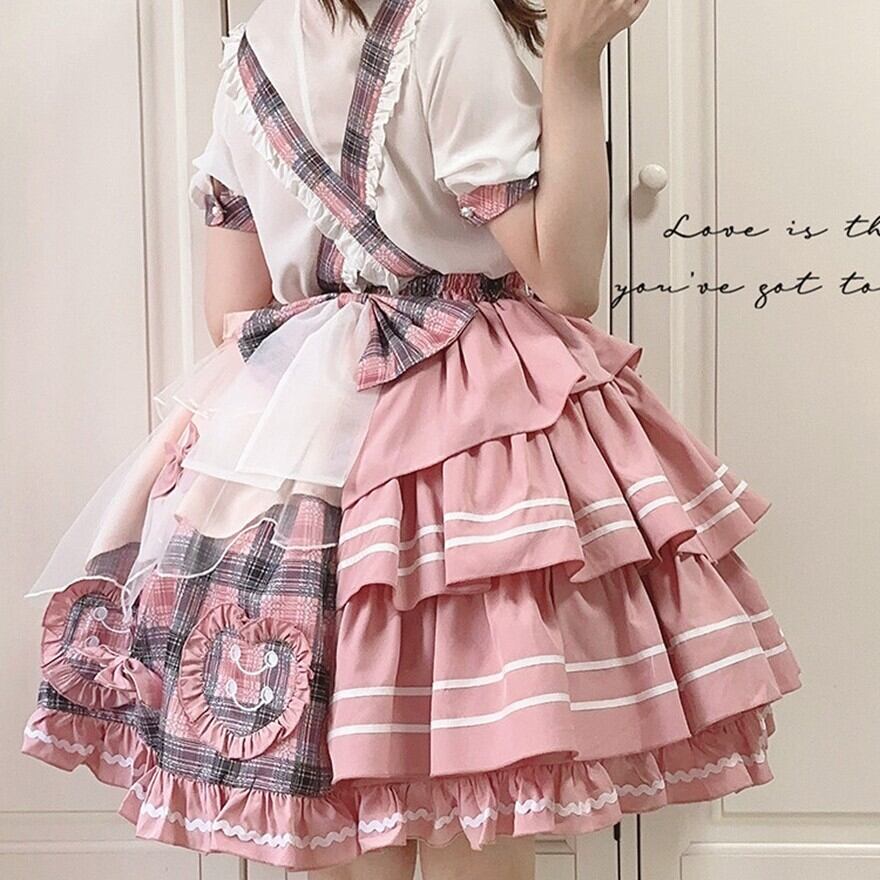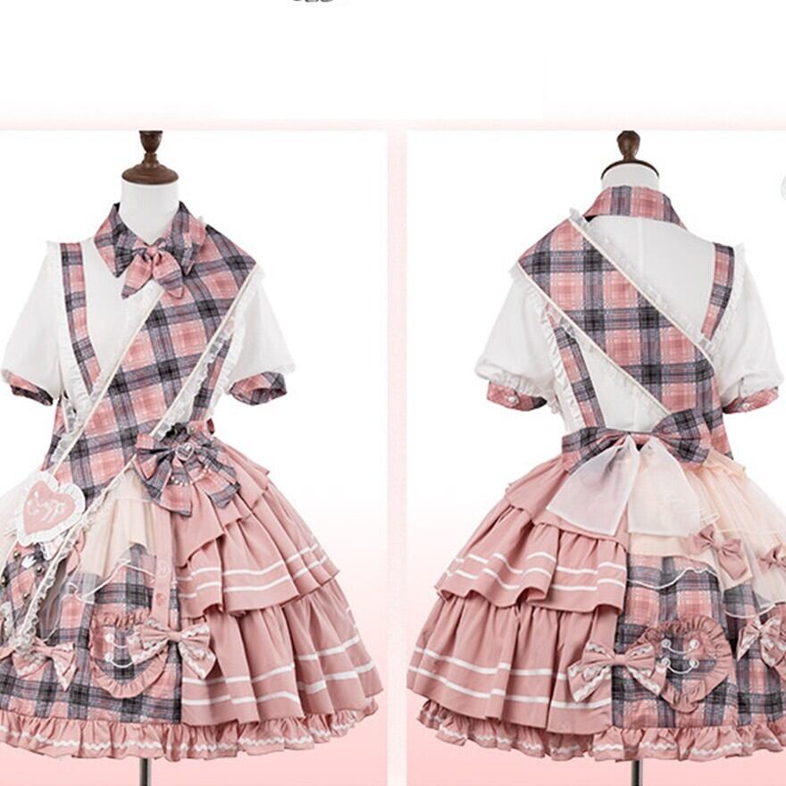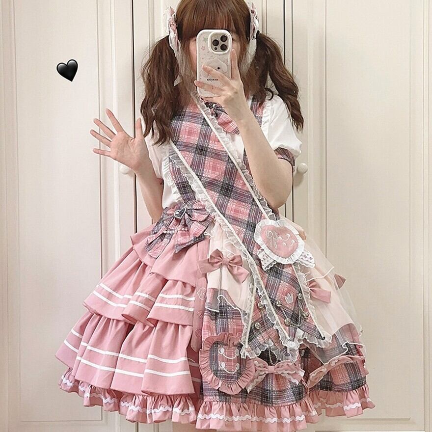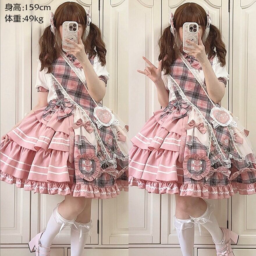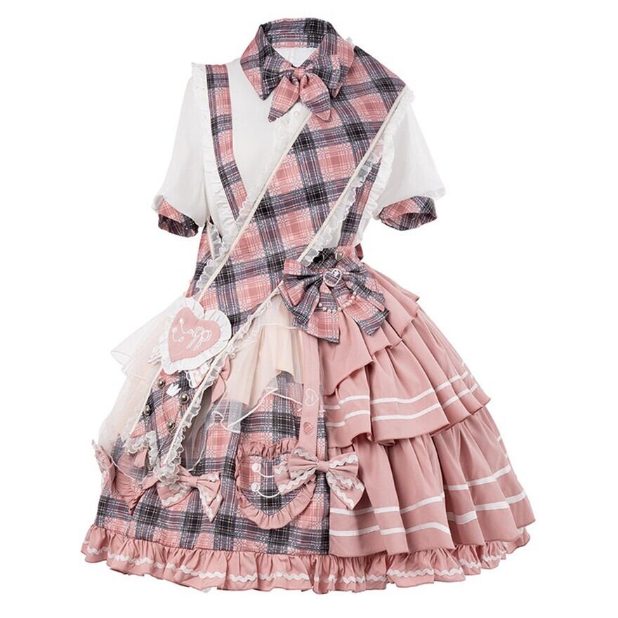 ピンクチェックとホワイトを組み合わせた、甘ロリらしい華やかさのあるセットアップです。ブラウスとジャンパースカートの2点構成で、リボンやフリル、ティアード風のスカートラインが可愛らしい印象を引き立てます。1着でしっかり世界観がまとまり、撮影やイベント、おでかけコーデにも使いやすいアイテムです。