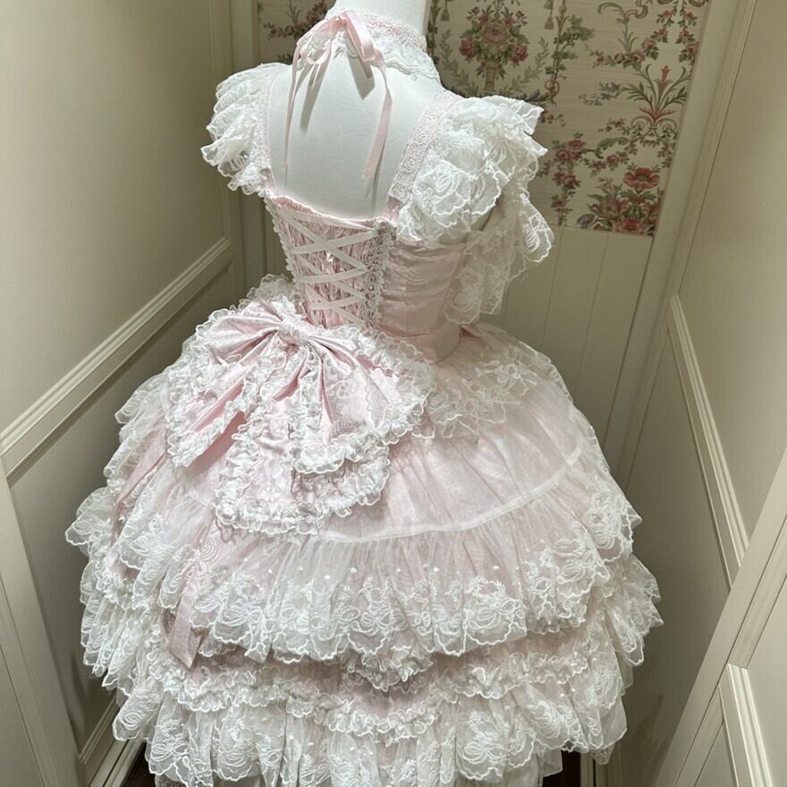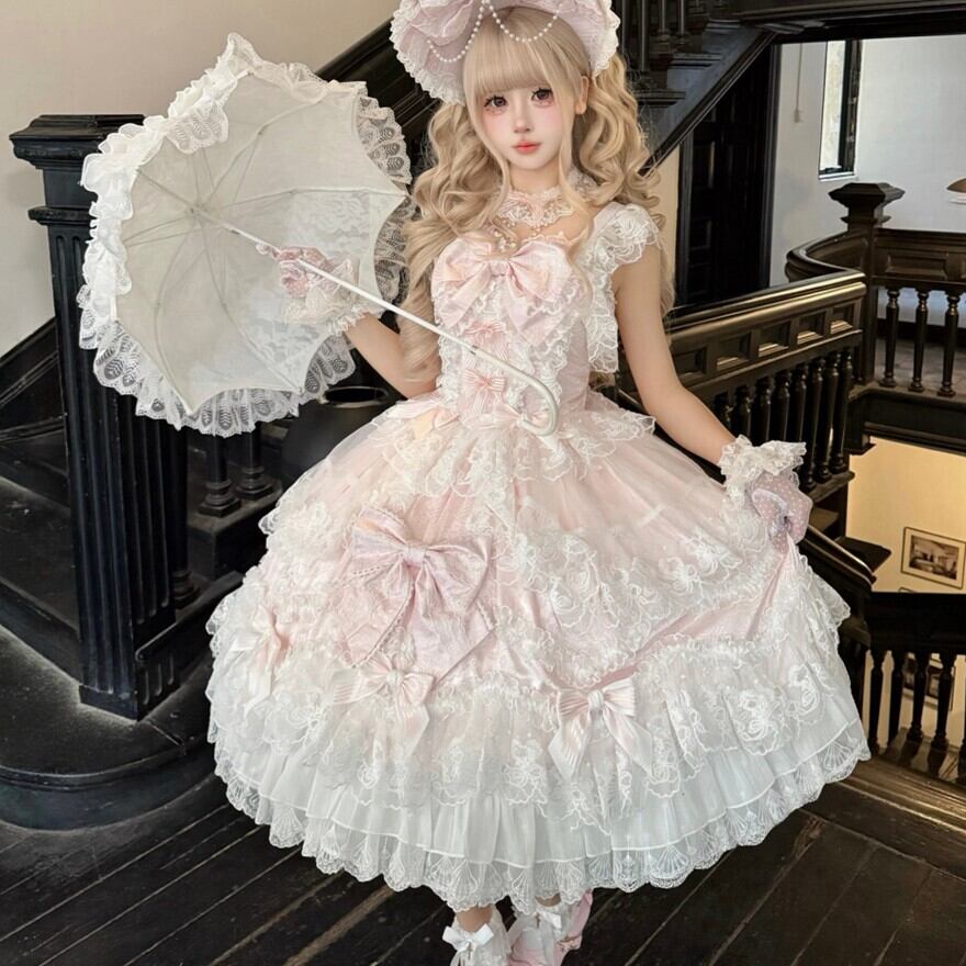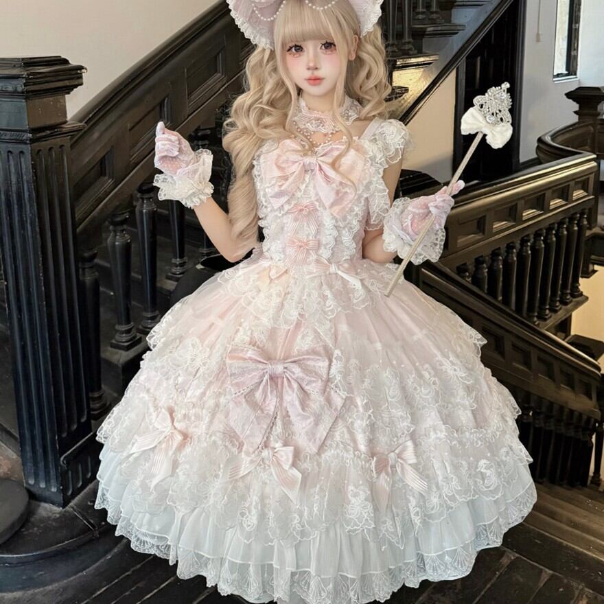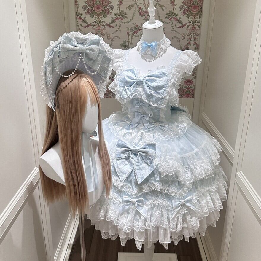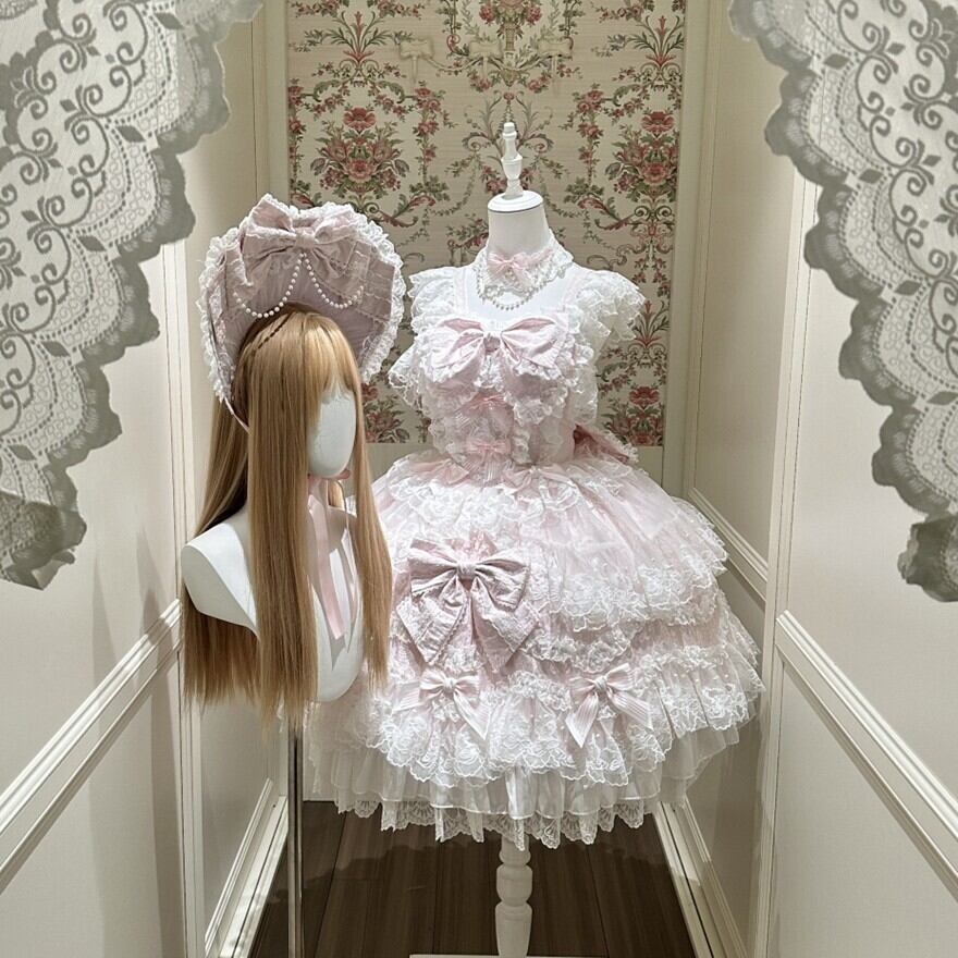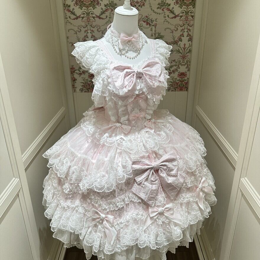 砂糖菓子のドレスをそっと重ねたような、ふんわり甘い甘ロリの世界観。淡いカラーと白レースの重なりが、まるでお人形のクローゼットから選んだ一着のような可憐さをまとわせてくれます。