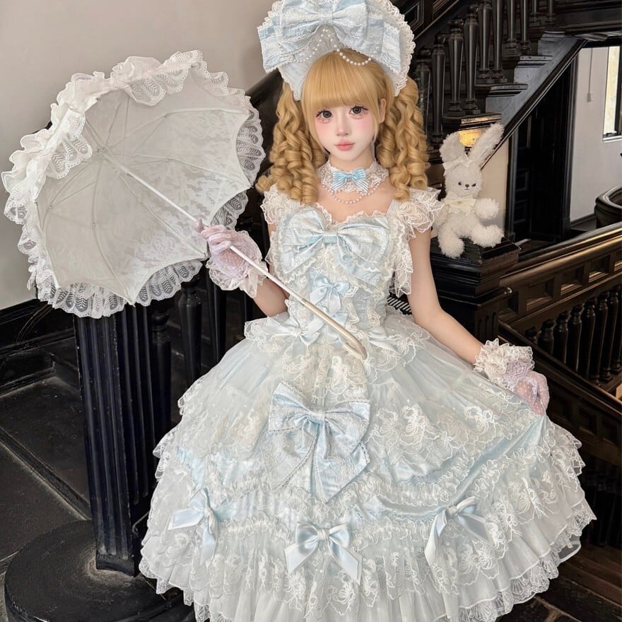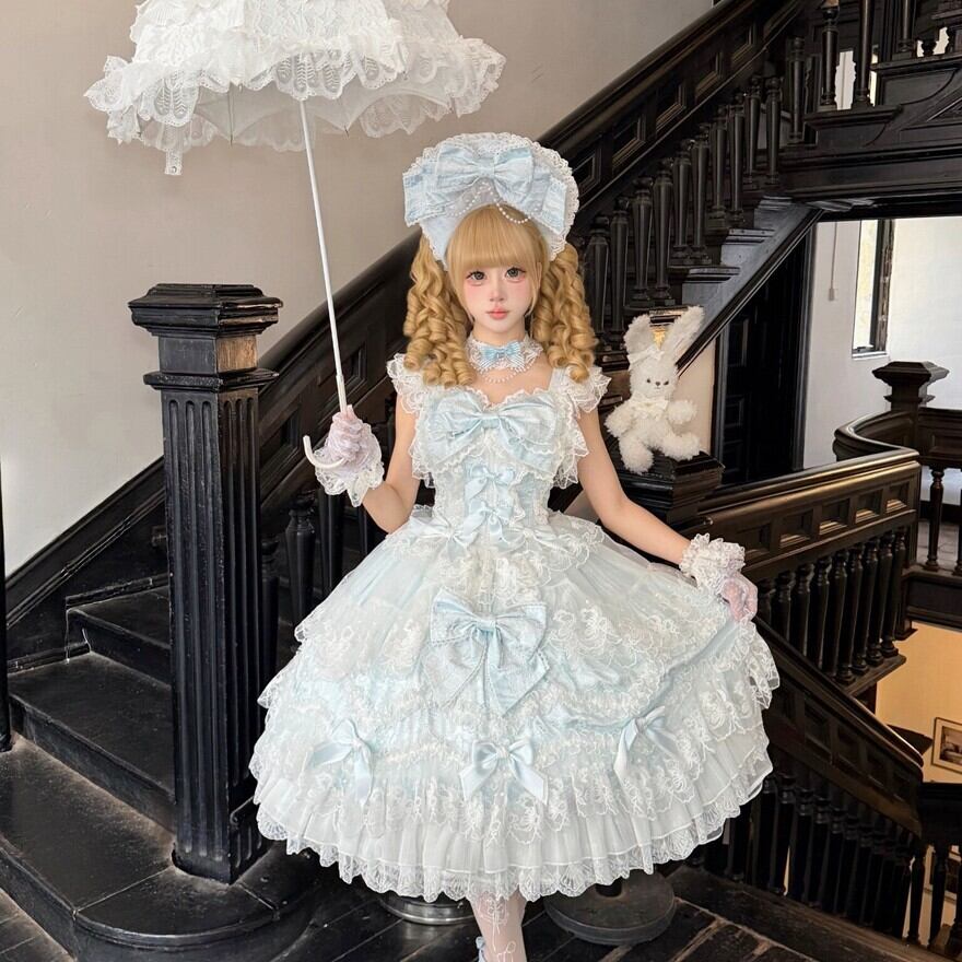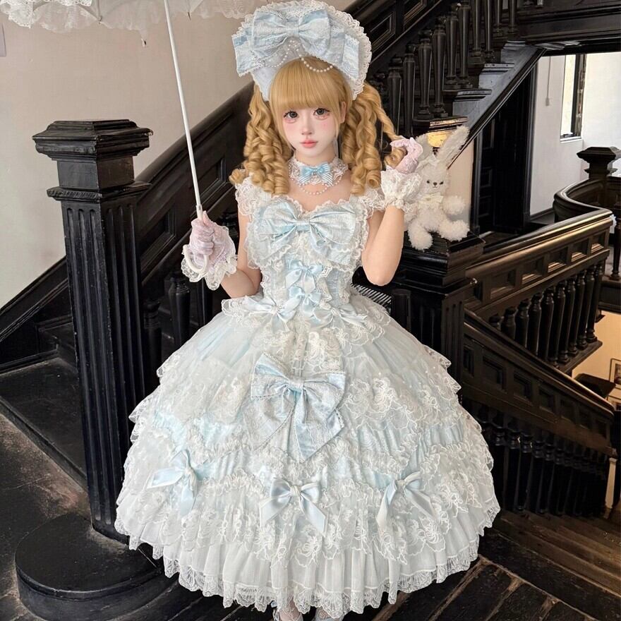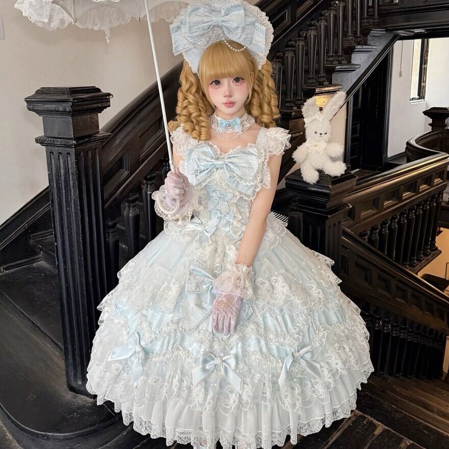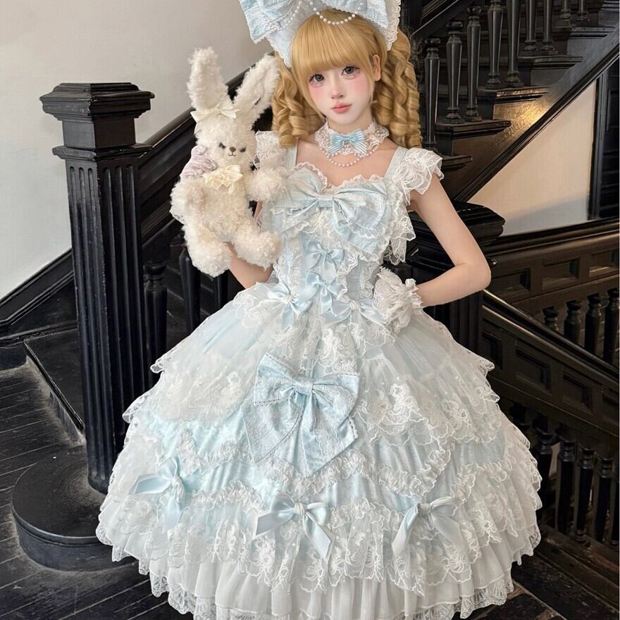 サックスブルーとピンクの淡い色合いに、白レースとフリルをたっぷり重ねた甘ロリのジャンパースカートです。胸元やスカートにあしらわれた大きめのリボンが、甘く華やかな印象を引き立てます。ワンピース感覚でコーデの主役になりやすく、特別感のある甘ロリを楽しみたい方におすすめの一着です。