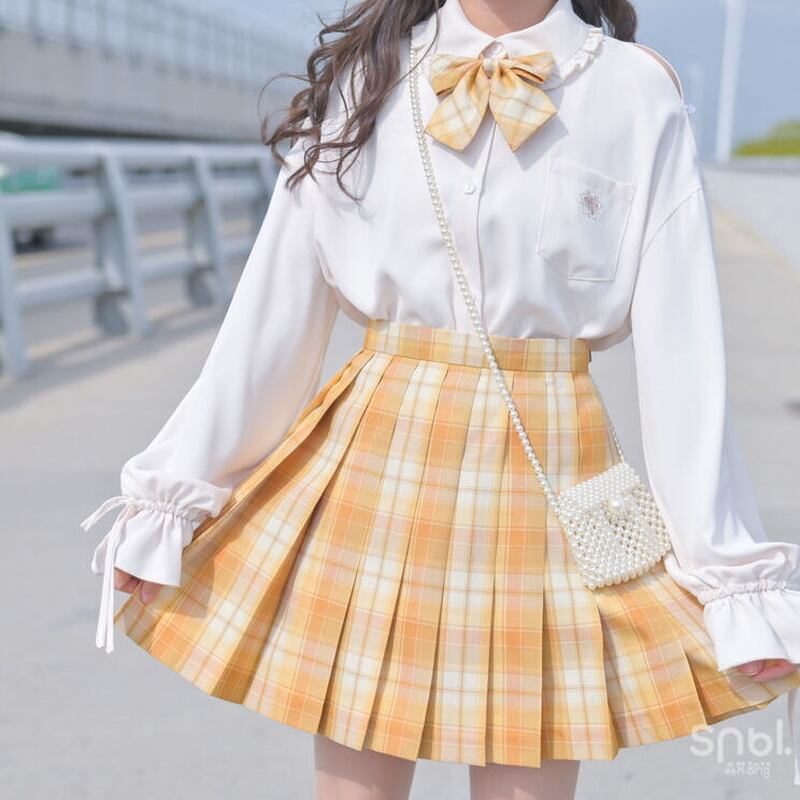 A. ブラウス単品なので、普段のスカートやパンツに合わせて取り入れやすいです。最初はチェック柄スカートや無地のプリーツスカートと合わせると、甘めの雰囲気を作りやすくなります。