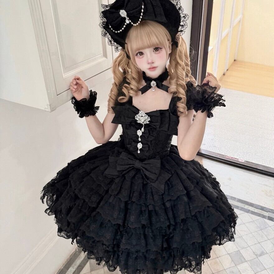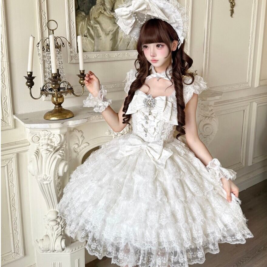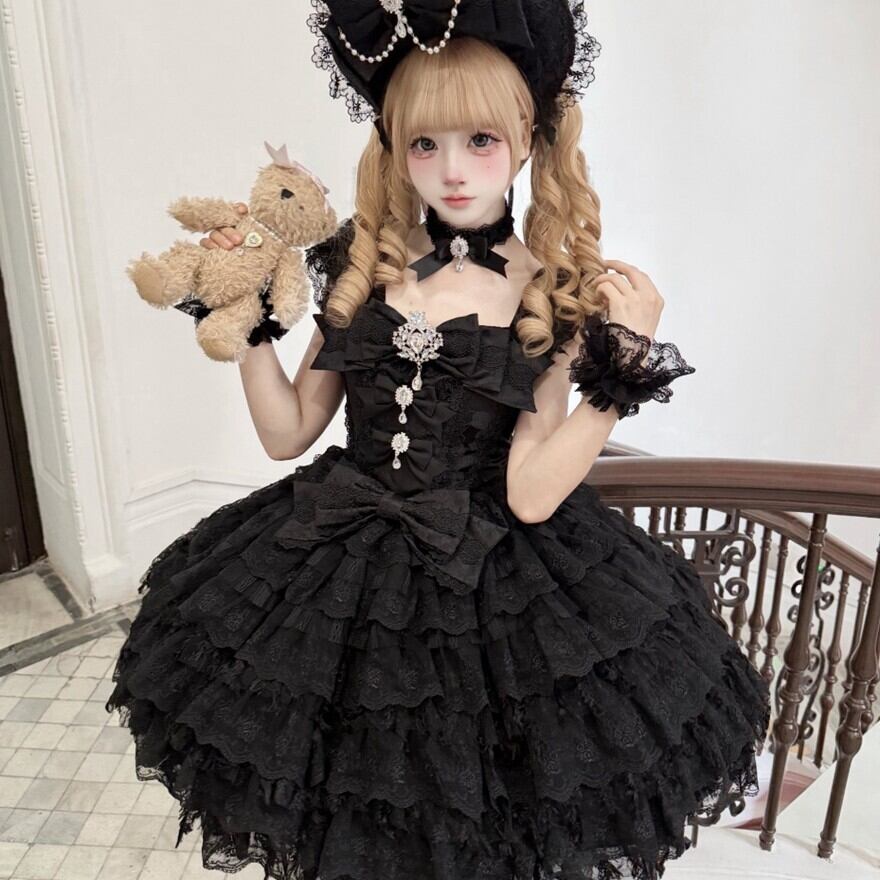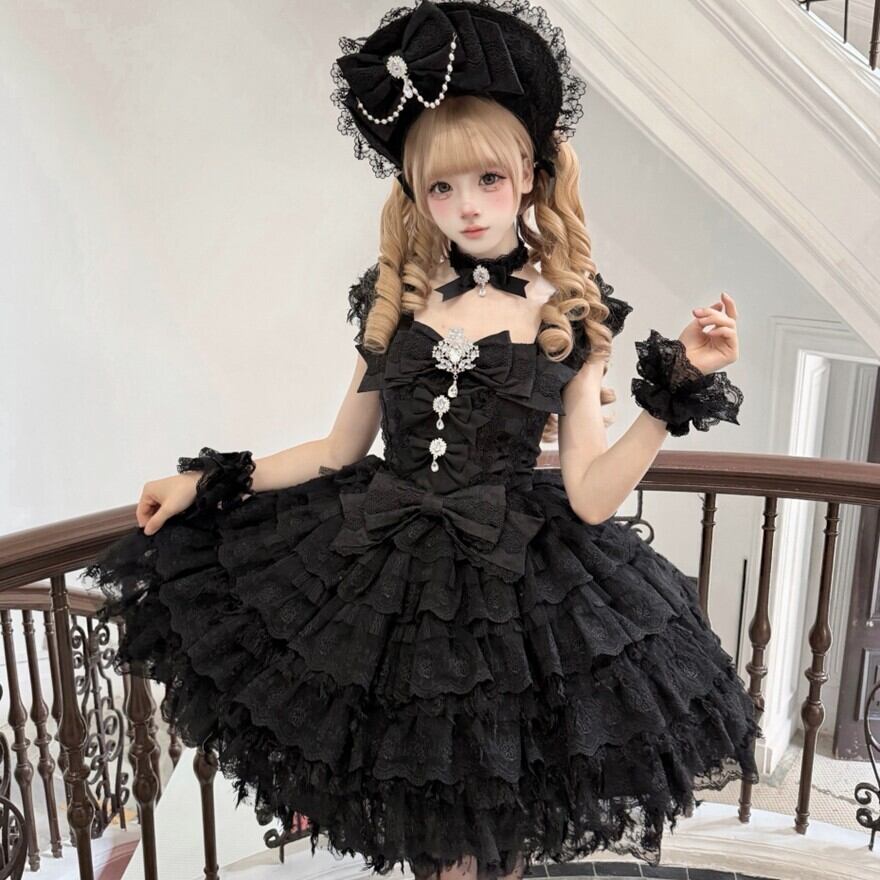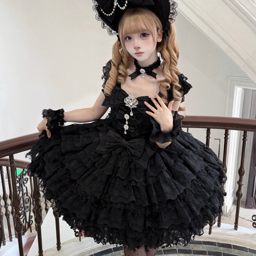たっぷり重ねたレースとフリルに、大きなリボンを添えた華やかなジャンパースカートセットです。ホワイトは清楚で甘い雰囲気に、ブラックは少しゴシック寄りの落ち着いた印象に仕上がります。ふんわり広がるシルエットが主役感を出してくれるため、特別なお出かけや撮影にも映える一着です。