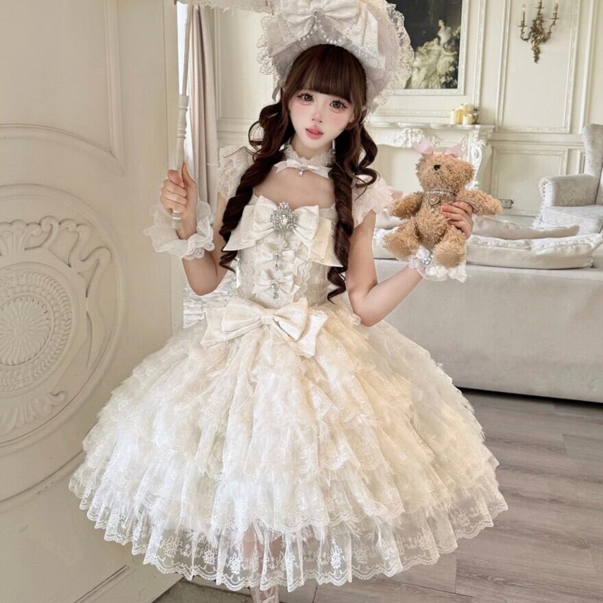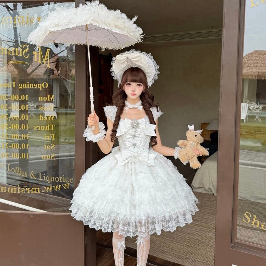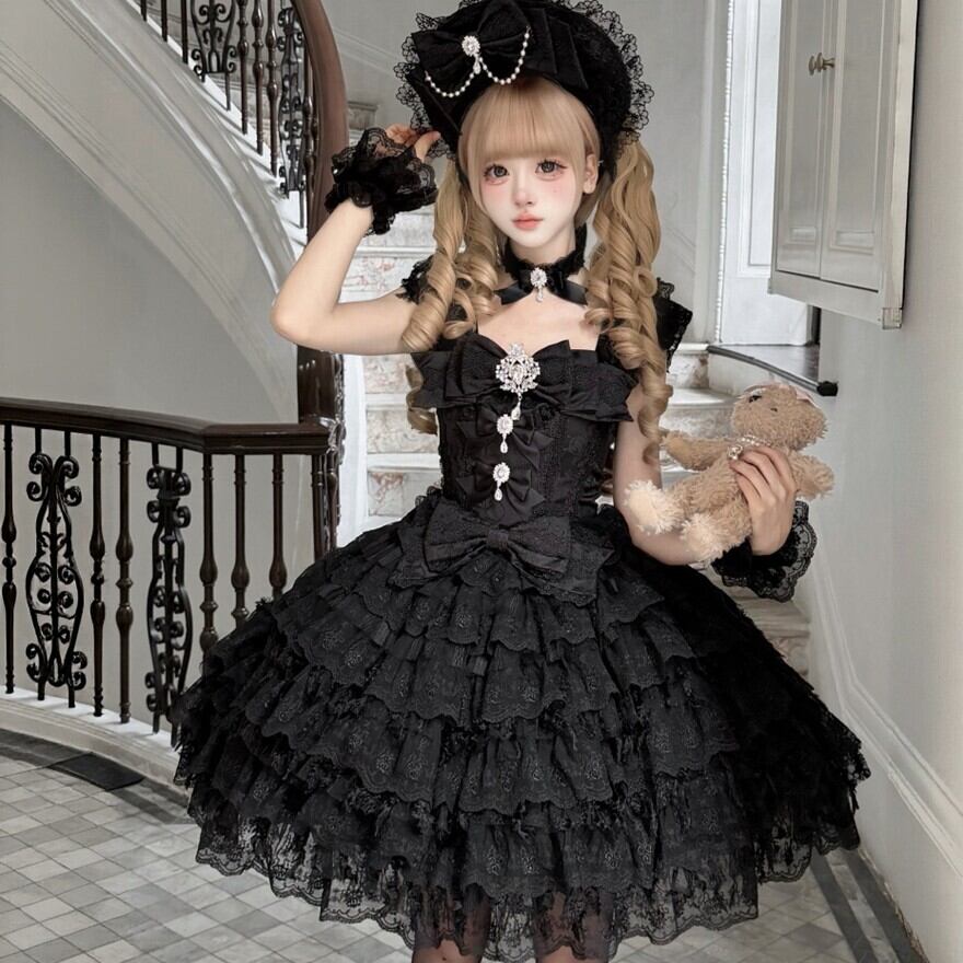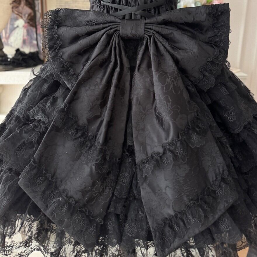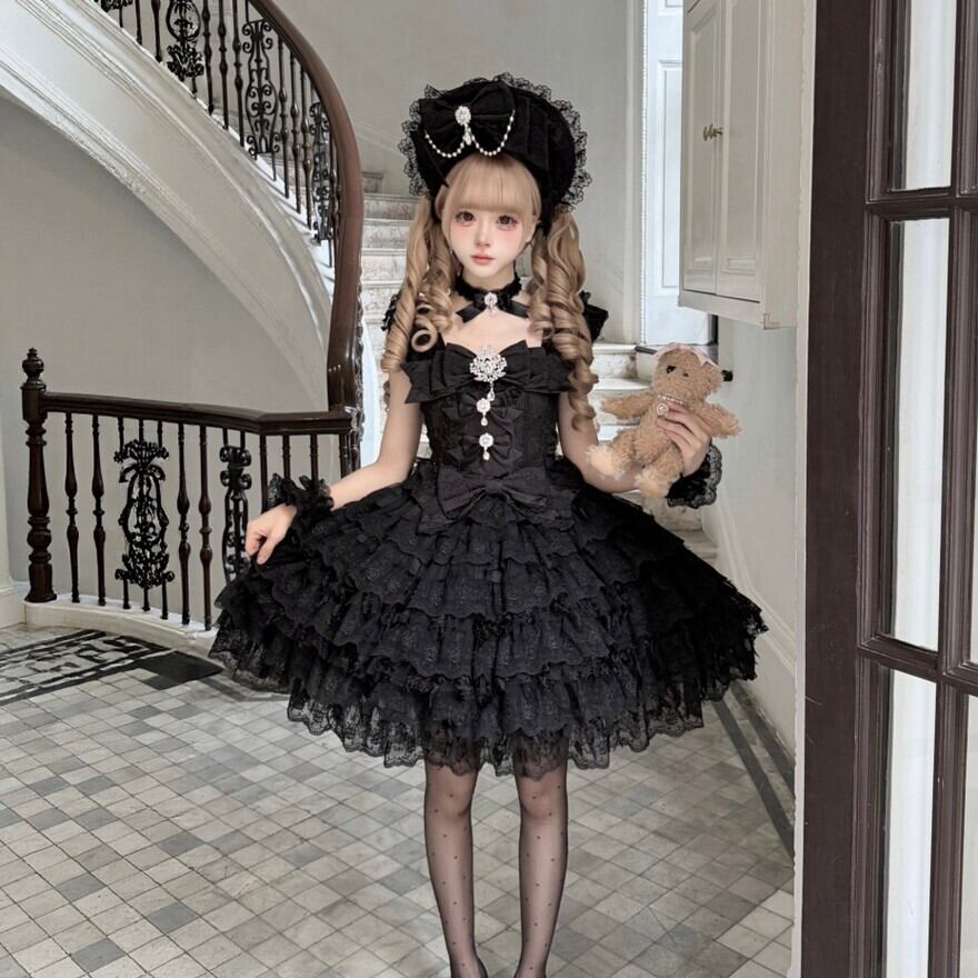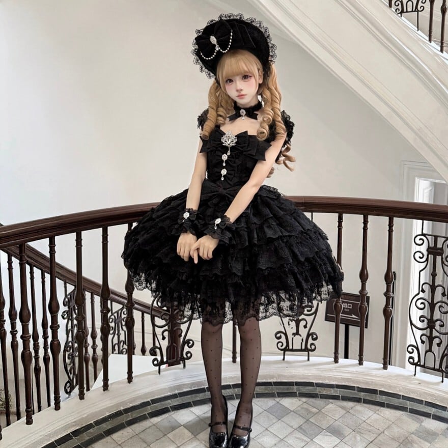たっぷり重ねたレースとフリルに、大きなリボンを添えた華やかなジャンパースカートセットです。ホワイトは清楚で甘い雰囲気に、ブラックは少しゴシック寄りの落ち着いた印象に仕上がります。ふんわり広がるシルエットが主役感を出してくれるため、特別なお出かけや撮影にも映える一着です。