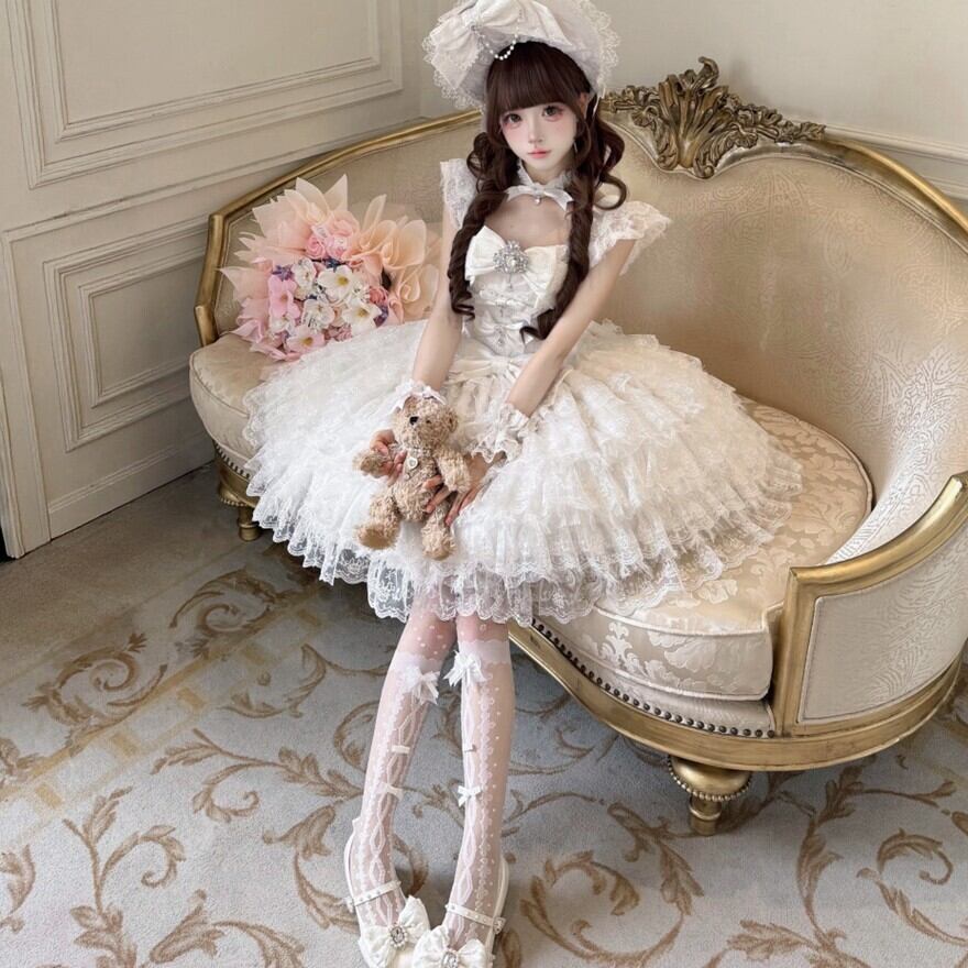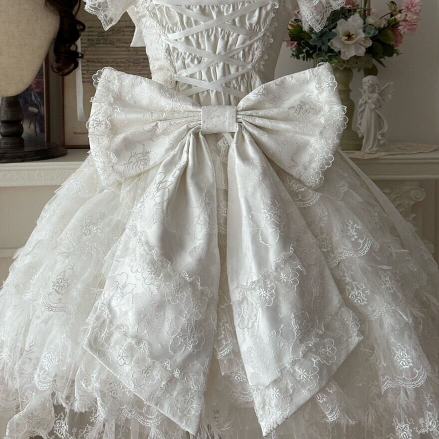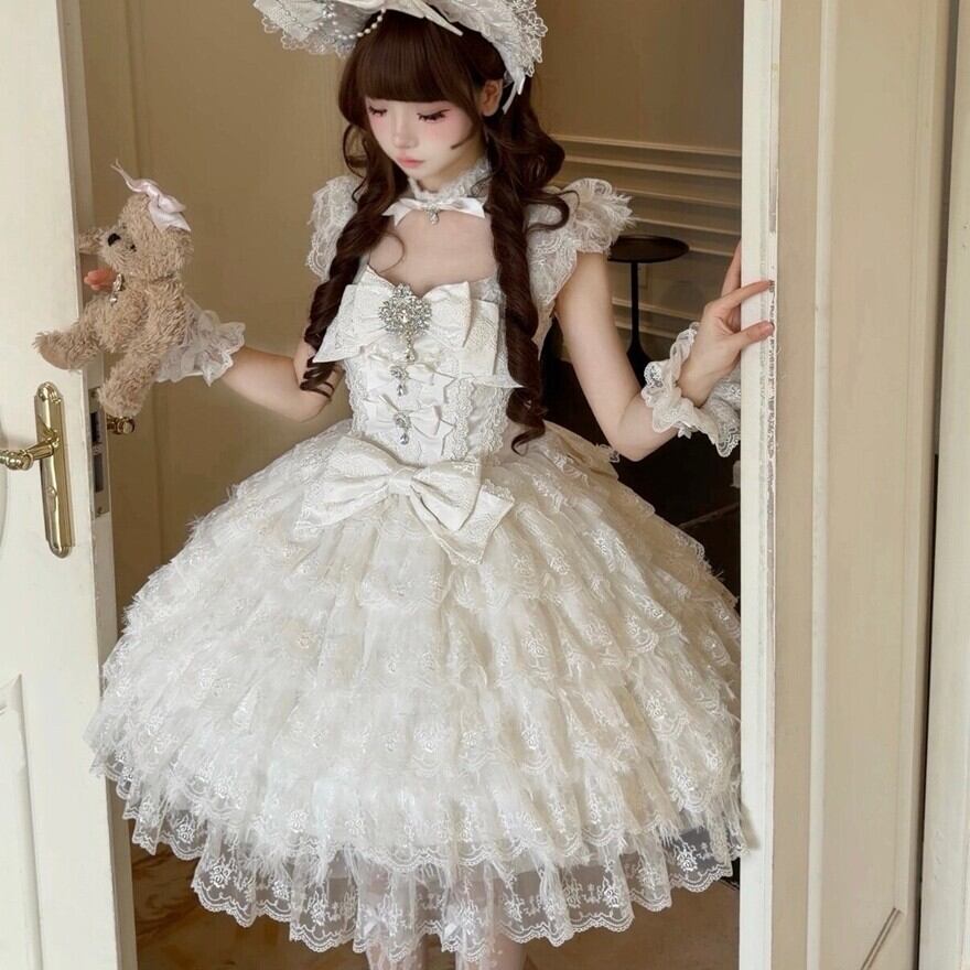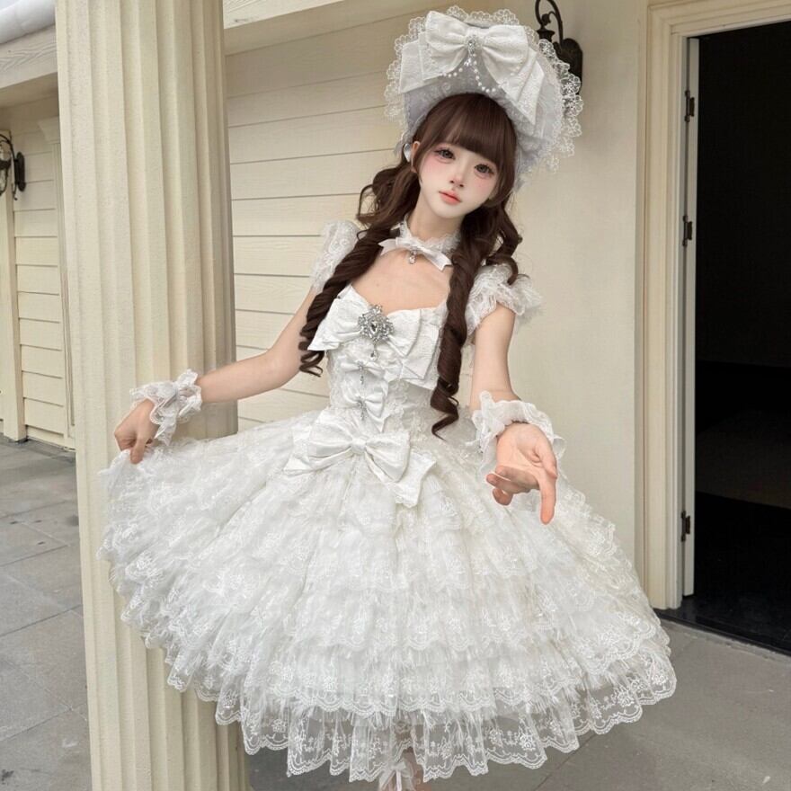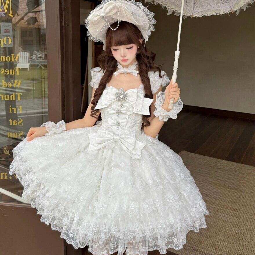 たっぷり重ねたレースとフリルに、大きなリボンを添えた華やかなジャンパースカートセットです。ホワイトは清楚で甘い雰囲気に、ブラックは少しゴシック寄りの落ち着いた印象に仕上がります。ふんわり広がるシルエットが主役感を出してくれるため、特別なお出かけや撮影にも映える一着です。