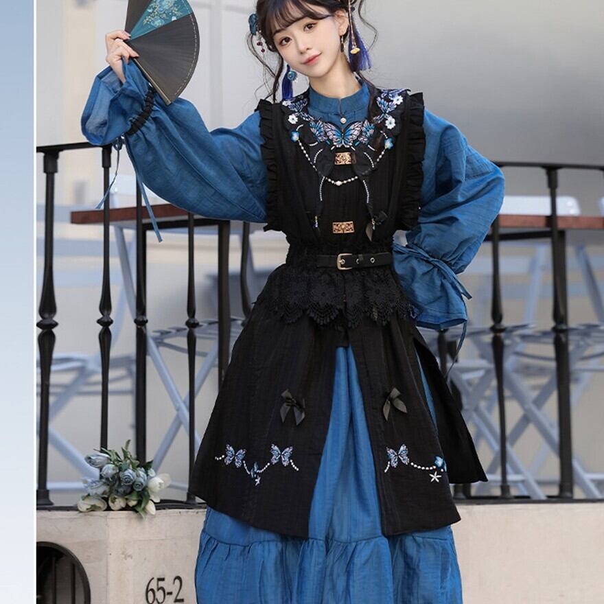 中華ロリータの蝶刺繍ロングベスト4点セット。ブルー×ブラックの落ち着いた配色で、甘さ控えめの中華ロリを楽しみたい方におすすめです。