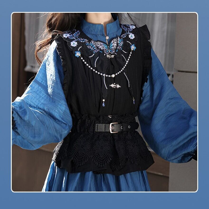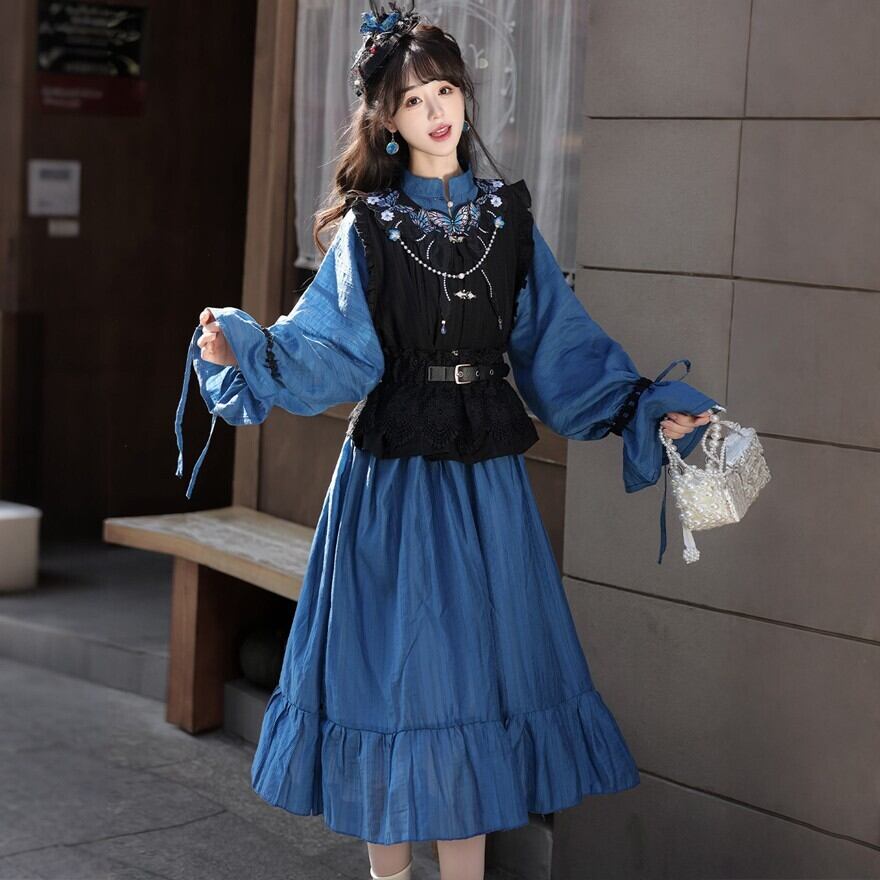 深いブルーのロングワンピースに、ブラックのショートベストを重ねた中華ロリータの4点セットです。胸元の蝶モチーフやネック装飾が華やかさを添え、ウエストベルトが全体をきりっと引き締めます。ロングベストタイプより軽やかに着こなしやすく、青黒の落ち着いた中華ロリコーデを楽しみたい方に向いた一着です。